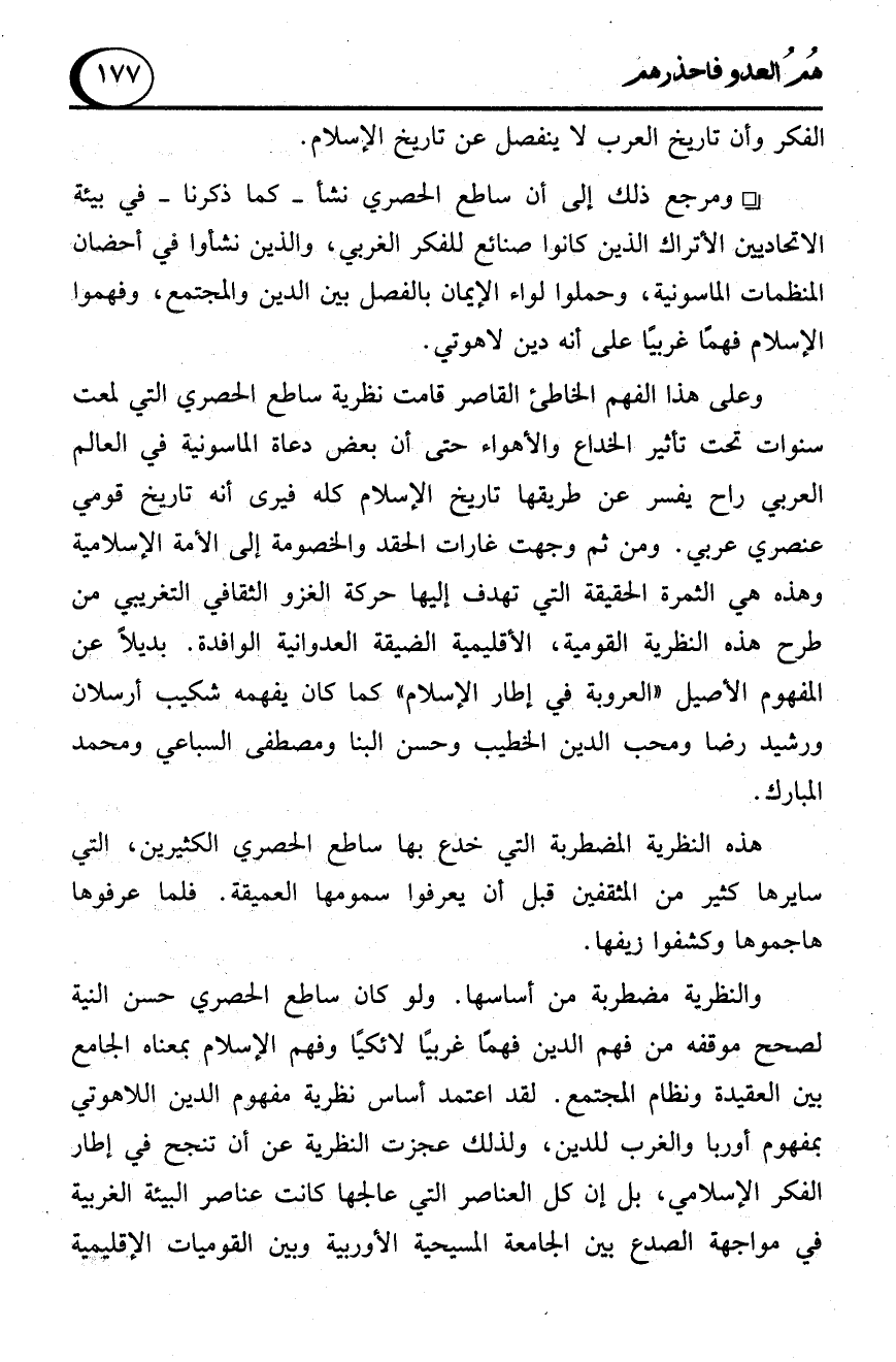 وعلى هذا الفهم الخاطى القاصر قامت نظرية ساطع الحصري التي لمعت سنوات تحت تأثير الخداع والأهواء حتى أن بعض دعاة الماسونية في العالم العربي راح يفسر عن طريقها تاريخ الإسلام كله فيرى أنه تاريخ قومي عنصري عربي. ومن ثم وجهت غارات الحقد والخصومة إلى الأمة الإسلامية وهذه هي الثمرة الحقيقة التي تهدف إليها حركة الغزو الثقافي التغريبي من طرح هذه النظرية القومية، الأقليمية الضيقة العدوانية الوافدة. بديلاً عن المفهوم الأصيل "العروبة في إطار الإسلام" كما كان يفهمه شكيب أرسلان ورشيد رضا ومحب الدين الخطيب وحسن البنا ومصطفى السباعي ومحمد المبارك.