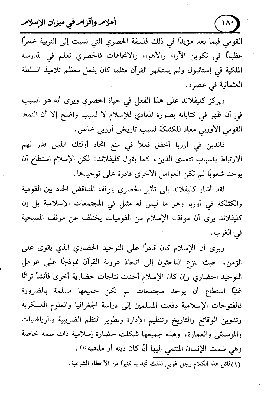ْلقد أشار كليفلاند إلى تأثير الحصري بموقفه المتناقض الحاد بين القومية والكثلكة في أوربا وهو ما ليس له مثيل في المجتمعات الإسلامية بل إن كليفلاند يرى أن موقف الإسلام من القوميات يختلف عن موقف المسيحية في الغرب.