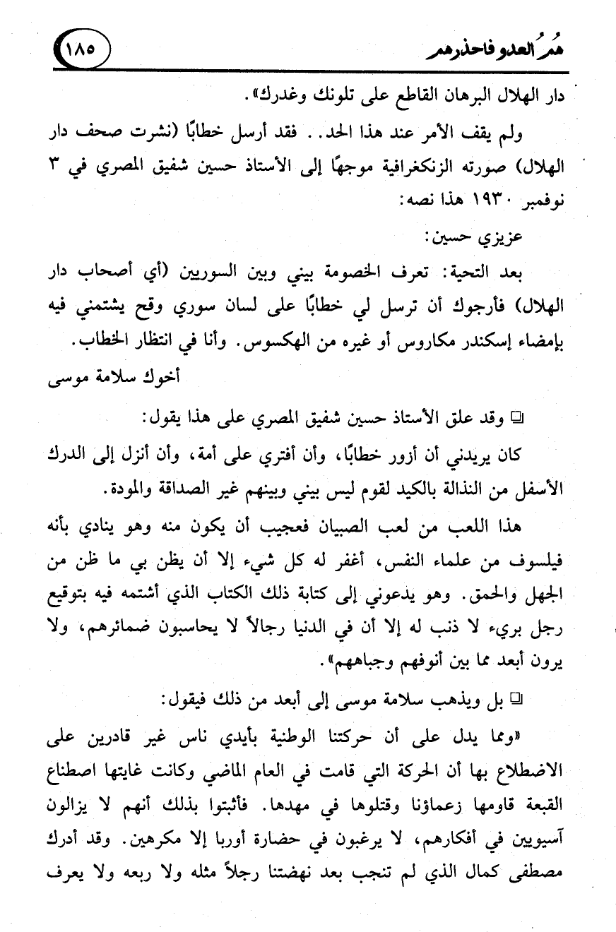 بعد التحية: تعرف الخصومة بيني وبين السوريين (أي أصحاب دار الهلال) فأرجوك أن ترسل لي خطابًا على لسان سوري وقح يشتمني فيه بإمضاء إسكندر مكاروس أو غيره من الهكسوس. وأنا في انتظار الخطاب.
