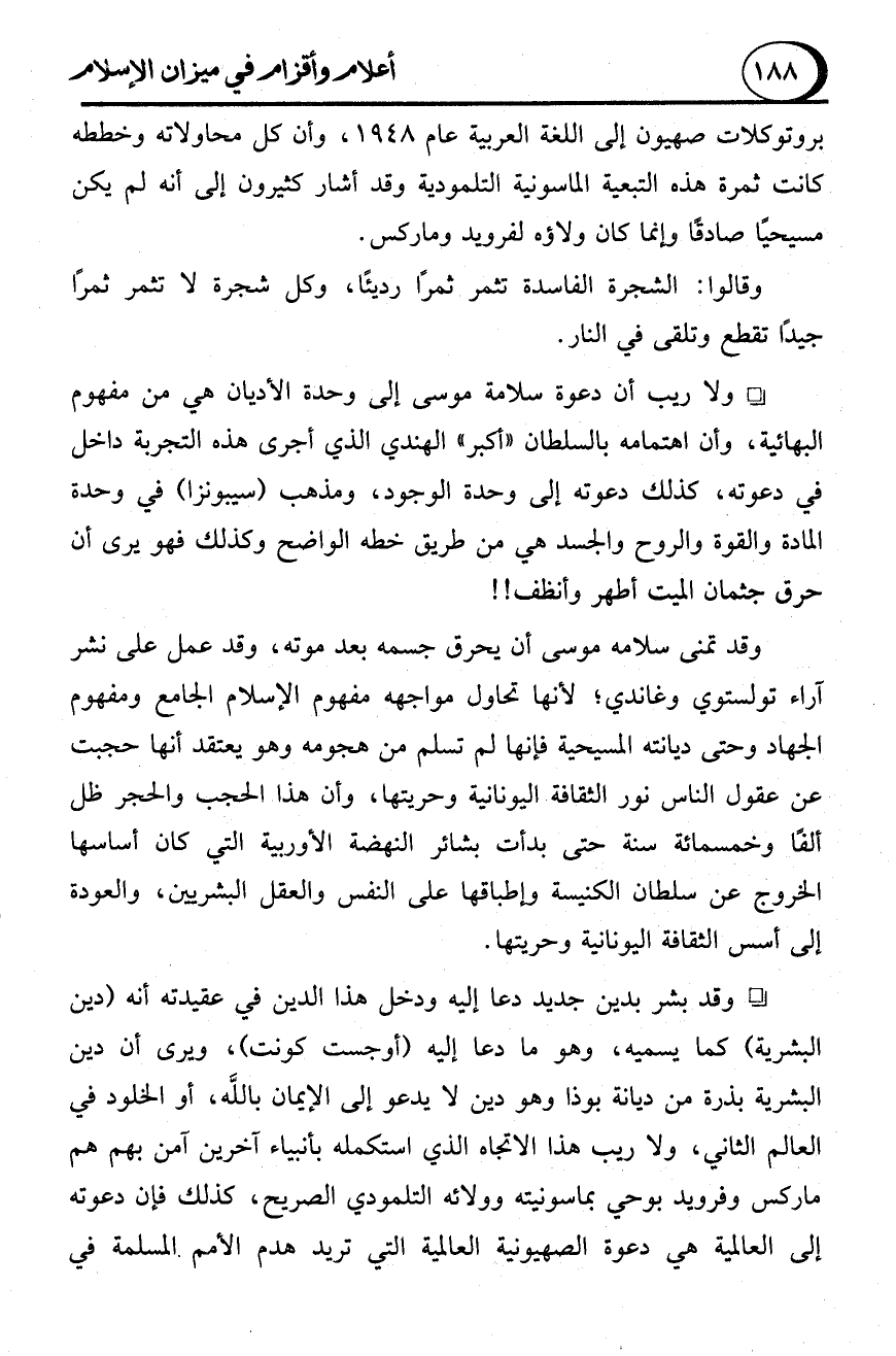 بروتوكلات صهيون إلى اللغة العربية عام 1948، وأن كل محاولاته وخططه كانت ثمرة هذه التبعية الماسونية التلمودية وقد أشار كثيرون إلى أنه لم يكن مسيحيًا صادقًا وإنما كان ولاؤه لفرويد وماركس.
