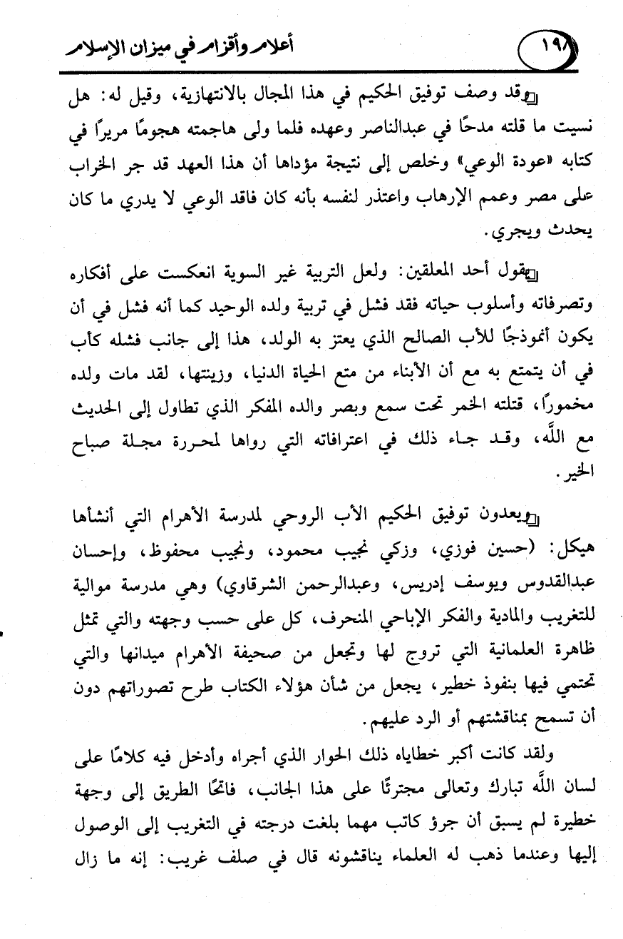 - يعدون توفيق الحكيم الأب الروحي لمدرسة الأهرام التي أنشأها هيكل: (حسين فوزي، وزكي نجيب محمود، ونجيب محفوظ، وإحسان عبد القدوس ويوسف إدريس، وعبد الرحمن الشرقاوي) وهي مدرسة موالية للتغريب والمادية والفكر الإباحي المنحرف، كل على حسب وجهته والتي تمثل ظاهرة العلمانية التي تروج لها وتجعل من صحيفة الأهرام ميدانها والتي تحتمي فيها بنفوذ خطير، يجعل من شأن هؤلاء الكتاب طرح تصوراتهم دون أن تسمح بمناقشتهم أو الرد عليهم.