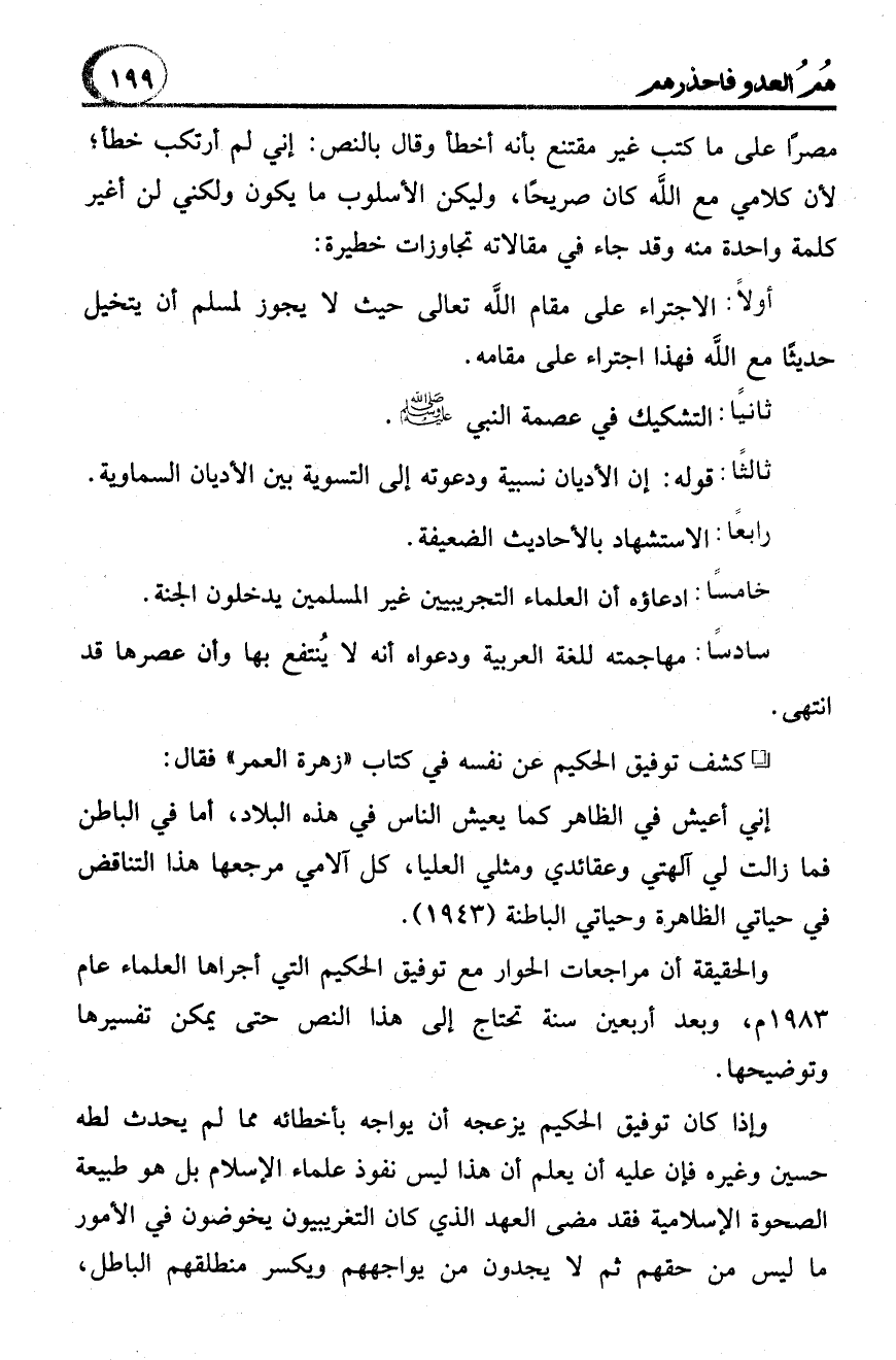 وإذا كان توفيق الحكيم يزعجه أن يواجه بأخطائه مما لم يحدث لطه حسين وغيره فإن عليه أن يعلم أن هذا ليس نفوذ علماء الإسلام بل هو طبيعة الصحوة الإسلامية فقد مضى العهد الذي كان التغريبيون يخوضون في الأمور ما ليس من حقهم ثم لا يجدون من يواجههم ويكسر منطلقهم الباطل،