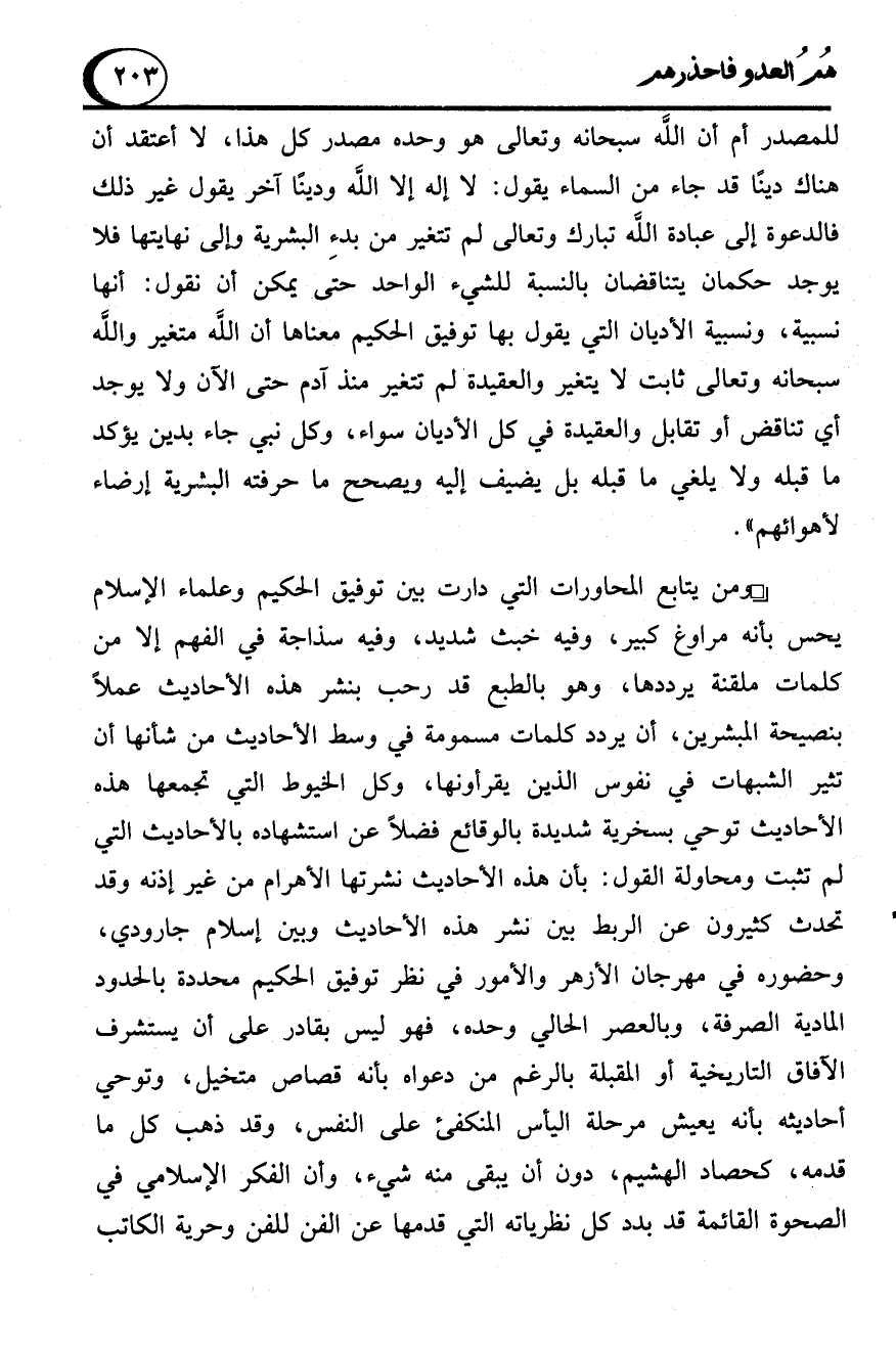 - من يتابع المحاورات التي دارت بين توفيق الحكيم وعلماء الإسلام يحس بأنه مراوغ كبير، وفيه خبث شديد، وفيه سذاجة في الفهم إلا من كلمات ملقنة يرددها، وهو بالطبع قد رحب بنشر هذه الأحاديث عملاً بنصيحة المبشرين، أن يردد كلمات مسمومة في وسط الأحاديث من شأنها أن تثير الشبهات في نفوس الذين يقرأونها، وكل الخيوط التي تجمعها هذه الأحاديث توحي بسخرية شديدة بالوقائع فضلاً عن استشهاده بالأحاديث التي لم تثبت ومحاولة القول: بأن هذه الأحاديث نشرتها الأهرام من غير إذنه وقد تحدث كثيرون عن الربط بين نشر هذه الأحاديث وبين إسلام جارودي، وحضوره في مهرجان الأزهر والأمور في نظر توفيق الحكيم محددة بالحدود المادية الصرفة، وبالعصر الحالي وحده، فهو ليس بقادر على أن يستشرف الآفاق التاريخية أو المقبلة بالرغم من دعواه بأنه قصاص متخيل، وتوحي أحاديثه بأنه يعيش مرحلة اليأس المنكفئ على النفس، وقد ذهب كل ما قدمه، كحصاد الهشيم، دون أن يبقى منه شيء، وأن الفكر الإسلامي في الصحوة القائمة قد بدد كل نظرياته التي قدمها عن الفن للفن وحرية الكاتب