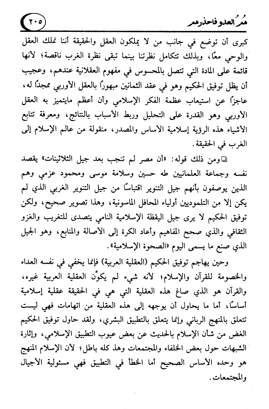 كبرى أن توضع في جانب من لا يملكون العقل والحقيقة أننا نملك العقل والوحي معًا، وبذلك تتكامل نظرتنا بينما تبقى نظرة الغرب ناقصة؛ لأنها قائمة على المادة التي تتصل بالمحسوس في مفهوم العقلانية عندهم، وعجيب أن يظل توفيق الحكيم وهو في عقد الثمانين مبهورًا بالعقل الأوربي ممجدًا له، عاجزًا عن استيعاب عظمة الفكر الإسلامي وأن أعظم ما يتميز به العقل الأوربي وهو القدرة على التحليل وربط الأسباب بالنتائج، ومعرفة تتابع الأشياء هذه الرؤية إسلامية الأساس والمصدر، منقولة من عالم الإسلام إلى الغرب في الحقيقة.