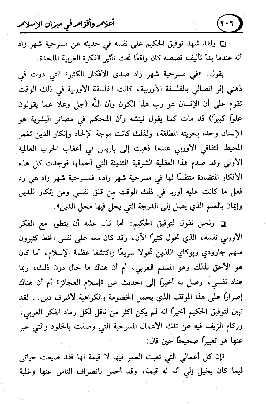 - ونحن نقول لتوفيق الحكيم: أما كان عليه أن يتطور مع الفكر الأوربي نفسه، الذي تحول كثيرًا الآن، وقد كان معه على نفس الخط كثيرون منهم جارودي وبوكاي اللذين تحولا سريعًا واكتشفا عظمة الإسلام، أما كان هو الأحق بذلك وهو المسلم العربي، أم أن هناك ما حال دون ذلك، ربما عناد نفسي، وصل به أخيراً إلى الحديث عن "إسلام العجائز" أم أن هناك إصرارًا على هذا الموقف الذي يحمل الخصومة والكراهية لأشرف دين .. لقد تبين لتوفيق الحكيم أخيرًا أنه لم يكن أكثر من ناقل لكل رماد الفكر الغربي، وركام الزيف فيه عن تلك الأعمال المسرحية التي وصفت بالخلود والتي عبر عنها هو تعبيرًا صحيحًا حين قال: