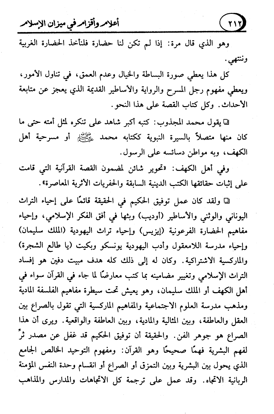 - ولقد كان عمل توفيق الحكيم في الحقيقة قائمًا على إحياء التراث اليوناني والوثني والأساطير (أوديب) وبثها في أفق الفكر الإسلامي، وإحياء مفاهيم الحضارة الفرعونية (إيزيس) وإحياء تراث اليهودية (الملك سليمان) وإحياء مدرسة اللامعقول وأدب اليهودية يونسكو وبكيت (يا طالع الشجرة) والماركسية الاشتراكية. وكان له إلى ذلك كله هدف مبيت دفين هو إفساد التراث الإسلامي وتغيير مضامينه بما كتب معارضًا لما جاء في القرآن سواء في أهل الكهف أو الملك سليمان، وهو يعيش تحت سيطرة مفاهيم الفلسفة المادية ومذهب مدرسة العلوم الأجتماعية والمفاهيم الماركسية التي تقول بالصراع بين العقل والعاطفة، وبين المثالية والمادية، وبين العاطفة والواقعية. ويرى أن هذا الصراع هو جوهر الفن. والحقيقة أن توفيق الحكيم قد غفل عن مصدر ثرِّ لفهم البشرية فهمًا صحيحًا وهو القرآن: ومفهوم التوحيد الخالص الجامع الذي يحول بين البشرية وبين التمزق أو الصراع أو انقسام وحدة النفس المؤمنة الربانية الاتجاه. وقد عمل على ترجمة كل الاتجاهات والمدارس والمذاهب