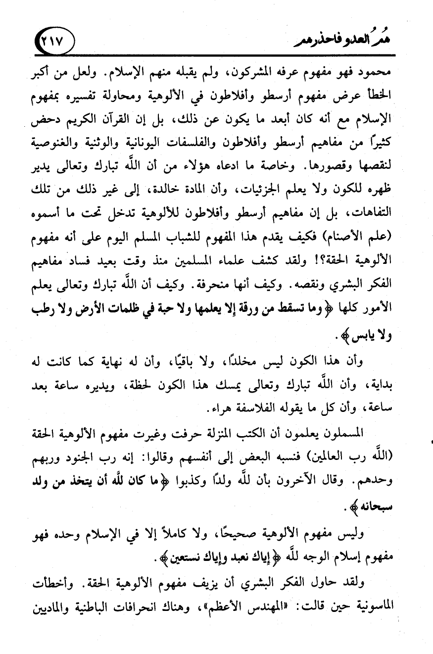 محمود فهو مفهوم عرفه المشركون، ولم يقبله منهم الإسلام. ولعل من أكبر الخطأ عرض مفهوم أرسطو وأفلاطون في الألوهية ومحاولة تفسيره بمفهوم الإسلام مع أنه كان أبعد ما يكون عن ذلك، بل إن القرآن الكريم دحض كثيرًا من مفاهيم أرسطو وأفلاطون والفلسفات اليونانية والوثنية والغنوصية لنقصها وقصورها. وخاصة ما ادعاه هؤلاء من أن الله تبارك وتعالى يدير ظهره للكون ولا يعلم الجزئيات، وأن المادة خالدة، إلى غير ذلك من تلك التفاهات، بل إن مفاهيم أرسطو وأفلاطون للألوهية تدخل تحت ما أسموه (علم الأصنام) فكيف يقدم هذا المفهوم للشباب المسلم اليوم على أنه مفهوم الألوهية الحقة؟! ولقد كشف علماء المسلمين منذ وقت بعيد فساد مفاهيم الفكر البشري ونقصه. وكيف أنها منحرفة. وكيف أن الله تبارك وتعالى يعلم الأمور كلها {وما تسقط من ورقة إِلا يعلمها ولا حبة في ظلمات الأرض ولا رطب ولا يابس}.