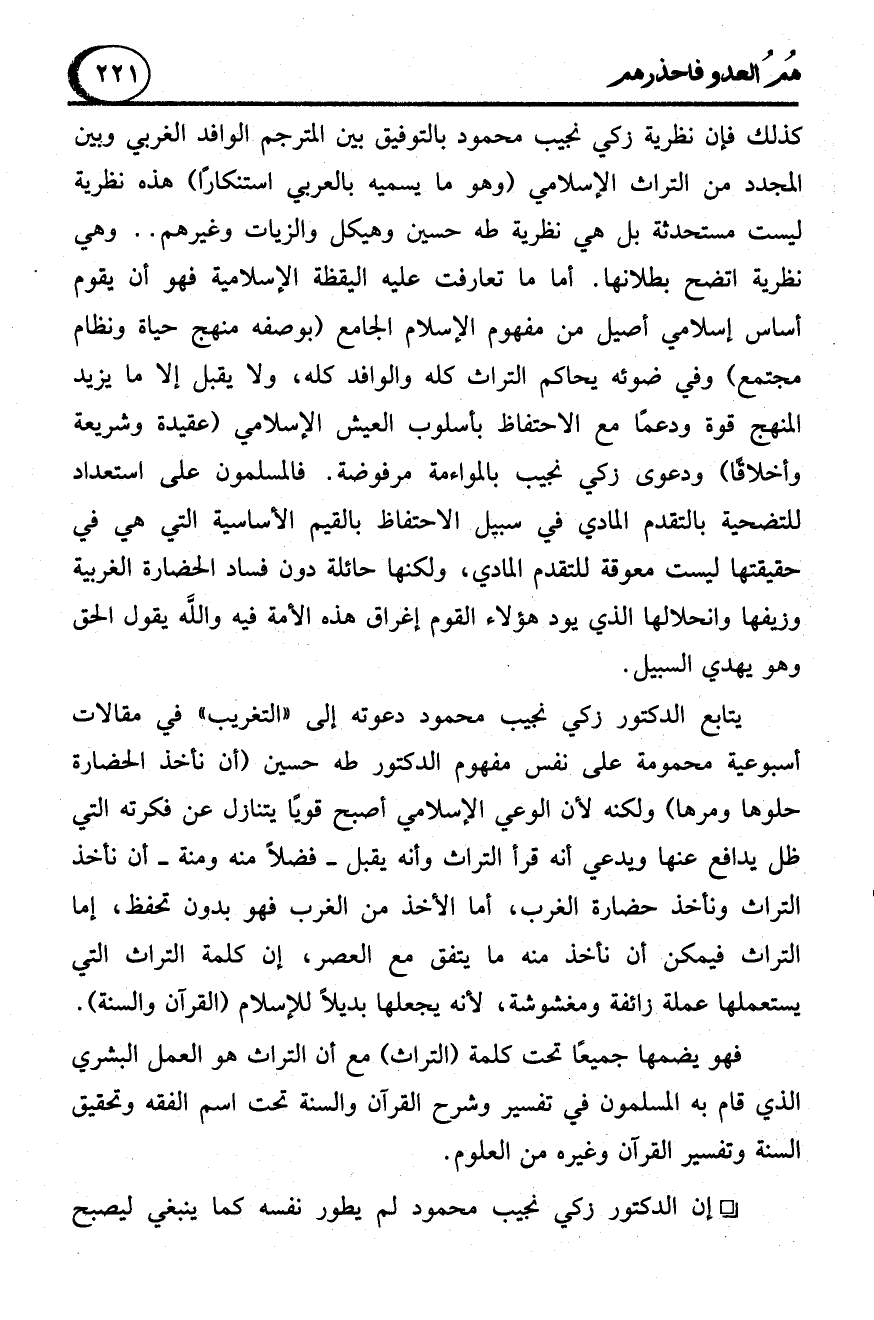 كذلك فإن نظرية زكي نجيب محمود بالتوفيق بين المترجم الوافد الغربي وبين المجدد من التراث الإسلامي (وهو ما يسميه بالعربي استنكارًا) هذه نظرية ليست مستحدثة بل هي نظرية طه حسين وهيكل والزيات وغيرهم .. وهي نظرية اتضح بطلانها. أما ما تعارفت عليه اليقظة الإسلامية فهو أن يقوم أساس إسلامي أصيل من مفهوم الإسلام الجامع (بوصفه منهج حياة ونظام مجتمع) وفي ضوئه يحاكم التراث كله والوافد كله، ولا يقبل إلا ما يزيد المنهج قوة ودعمًا مع الاحتفاظ بأسلوب العيش الإسلامي (عقيدة وشريعة وأخلاقًا) ودعوى زكي نجيب بالمواءمة مرفوضة. فالمسلمون على استعداد للتضحية بالتقدم المادي في سبيل الاحتفاظ بالقيم الأساسية التي هي في حقيقتها ليست معوقة للتقدم المادي، ولكنها حائلة دون فساد الحضارة الغربية وزيفها وانحلالها الذي يود هؤلاء القوم إغراق هذه الأمة فيه والله يقول الحق وهو يهدي السبيل.
