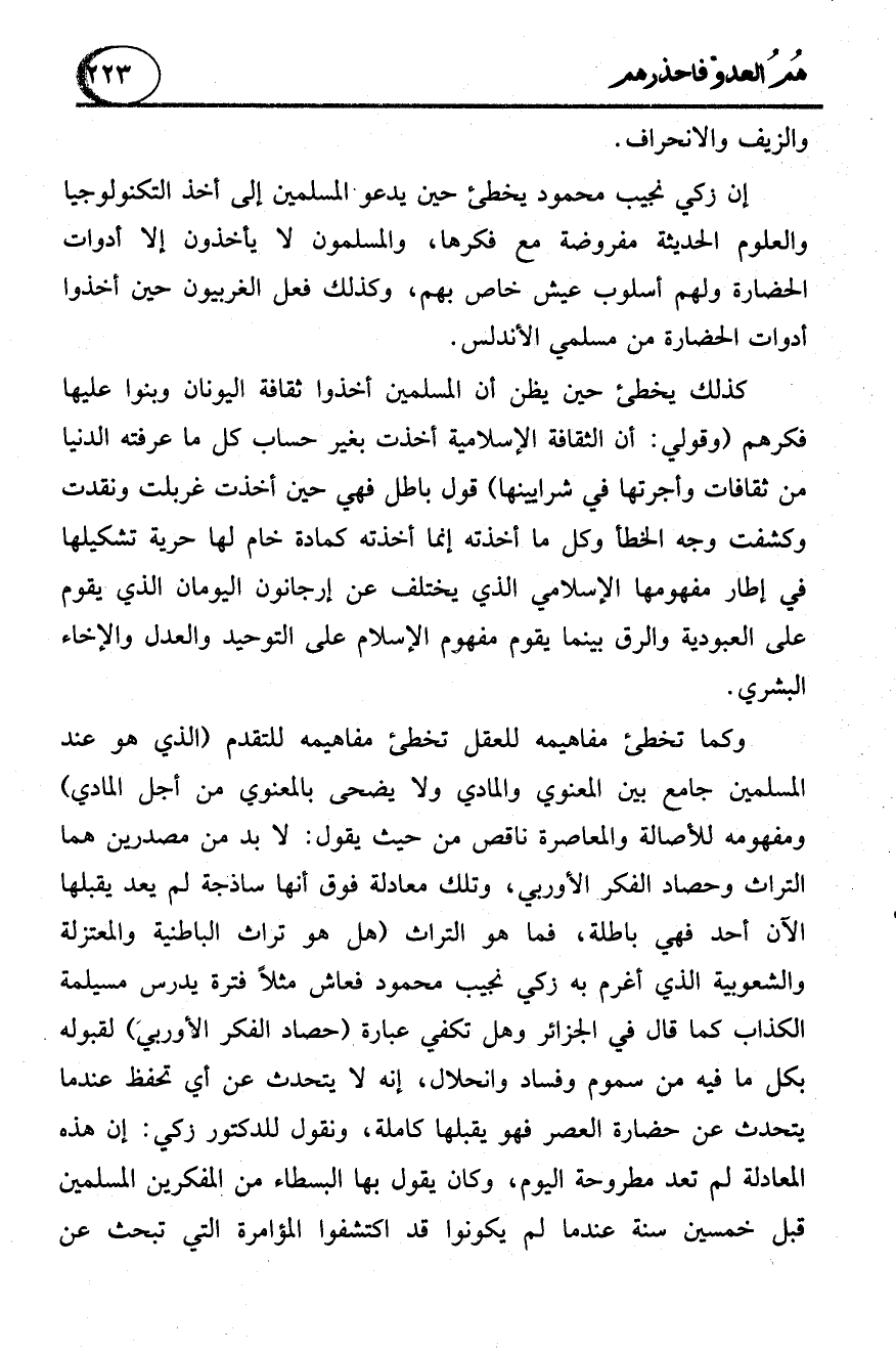 إن زكي نجيب محمود يخطئ حين يدعو المسلمين إلى أخذ التكنولوجيا والعلوم الحديثة مفروضة مع فكرها، والمسلمون لا يأخذون إلا أدوات الحضارة ولهم أسلوب عيش خاص بهم، وكذلك فعل الغربيون حين أخذوا أدوات الحضارة من مسلمي الأندلس.