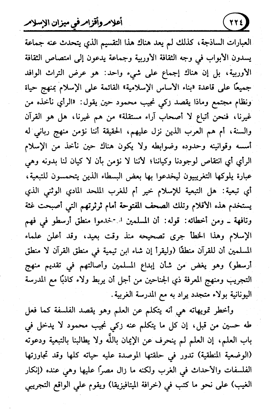 العبارات الساذجة، كذلك لم يعد هناك هذا التقسيم الذي يتحدث عنه جماعة يسدون الأبواب في وجه الثقافة الأوربية وجماعة يدعون إلى امتصاص الثقافة الأوربية، بل إن هناك إجماع على شيء واحد: هو عرض التراث الوافد جميعًا على قاعدة "بناء الأساس الإسلامية" القائمة على الإسلام بمنهج حياة ونظام مجتمع وماذا يقصد زكي نجيب محمود حين يقول: "الرأي نأخذه من غيرنا، فنحن أتباع لا أصحاب آراء مستقلة" من هم غيرنا، هل هو القرآن والسنة، أم هم العرب الذين نزل عليهم، الحقيقة أننا نؤمن منهج رباني له أسسه وقوانينه وحدوده وضوابطه ولا يكون هناك حين نأخذ من الإسلام الرأي أي انتقاص لوجودنا وكياننا؛ لأننا لا نؤمن بأن لا كيان لنا بدونه وهي عبارة يلوكها التغريبيون ليخدعوا بها بعض البسطاء الذين يتحمسون للتبعية، أي تبعية: هل التبعية للإسلام خير أم للغرب الملحد المادي الوثني الذي يستخدم هذه الأقلام وتلك الصحف المفتوحة أمام ثرثرتهم التي أصبحت غثة وتافهة - ومن أخطائه: قوله: أن المسلمين استخدموا منطق أرسطو في فهم الإسلام وهذا الخطأ جرى تصحيحه منذ وقت بعيد، وقد أعلن علماء المسلمين أن للقرآن منطقًا (وليقرأ إن شاء ابن تيمية في منطق القرآن لا منطق أرسطو) وهو يغض من شأن إبداع المسلمين وأصالتهم في تقديم منهج التجريب ومنهج المعرفة ذي الجناحين من أجل أن يربط ولاء كاذبًا مع المدرسة اليونانية بولاء متجدد يراد به مع المدرسة الغربية.