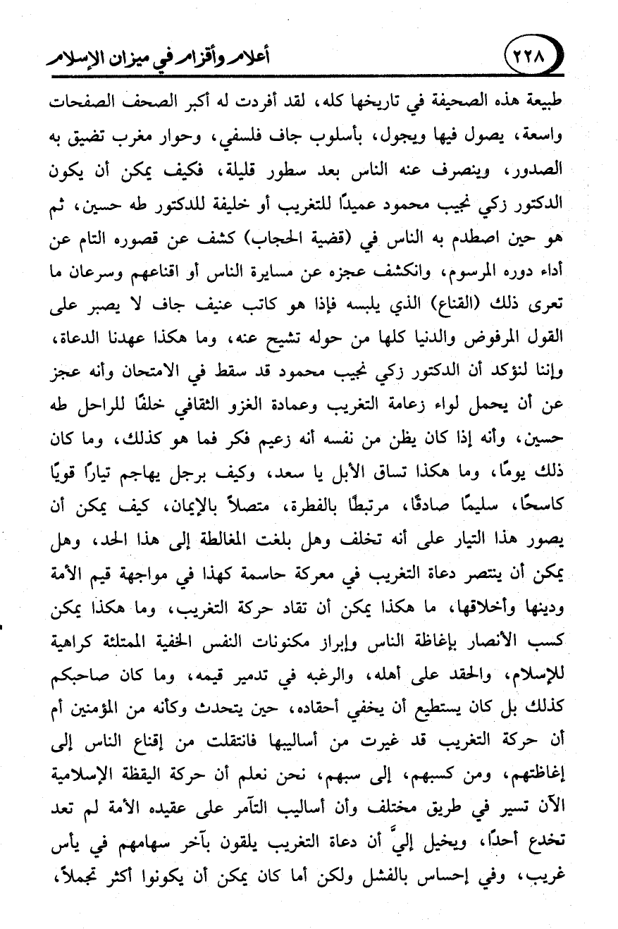طبيعة هذه الصحيفة في تاريخها كله، لقد أفردت له أكبر الصحف الصفحات واسعة، يصول فيها ويجول، بأسلوب جاف فلسفي، وحوار مغرب تضيق به الصدور، وينصرف عنه الناس بعد سطور قليلة، فكيف يمكن أن يكون الدكتور زكي نجيب محمود عميدًا للتغريب أو خليفة للدكتور طه حسين، ثم هو حين اصطدم به الناس في (قضية الحجاب) كشف عن قصوره التام عن أداء دوره المرسوم، وانكشف عجزه عن مسايرة الناس أو اقناعهم وسرعان ما تعرى ذلك (القناع) الذي يلبسه فإذا هو كاتب عنيف جاف لا يصبر على القول المرفوض والدنيا كلها من حوله تشيح عنه، وما هكذا عهدنا الدعاة، وإننا لنؤكد أن الدكتور زكي نجيب محمود قد سقط في الامتحان وأنه عجز عن أن يحمل لواء زعامة التغريب وعمادة الغزو الثقافي خلفًا للراحل طه حسين، وأنه إذا كان يظن من نفسه أنه زعيم فكر فما هو كذلك، وما كان ذلك يومًا، وما هكذا تساق الأبل يا سعد، وكيف برجل يهاجم تيارًا قويًا كاسحًا، سليمًا صادقًا، مرتبطًا بالفطرة، متصلاً بالإيمان، كيف يمكن أن يصور هذا التيار على أنه تخلف وهل بلغت المغالطة إلى هذا الحد، وهل يمكن أن ينتصر دعاة التغريب في معركة حاسمة كهذا في مواجهة قيم الأمة ودينها وأخلاقها، ما هكذا يمكن أن تقاد حركة التغريب، وما هكذا يمكن كسب الأنصار بإغاظة الناس وإبراز مكنونات النفس الخفية الممتلئة كراهية للإسلام، والحقد على أهله، والرغبه في تدمير قيمه، وما كان صاحبكم كذلك بل كان يستطيع أن يخفي أحقاده، حين يتحدث وكأنه من المؤمنين أم أن حركة التغريب قد غيرت من أساليبها فانتقلت من إقناع الناس إلى إغاظتهم، ومن كسبهم، إلى سبهم، نحن نعلم أن حركة اليقظة الإسلامية الآن تسير في طريق مختلف وأن أساليب التآمر على عقيده الأمة لم تعد تخدع أحدًا، ويخيل إليَّ أن دعاة التغريب يلقون بآخر سهامهم في يأس غريب، وفي إحساس بالفشل ولكن أما كان يمكن أن يكونوا أكثر تجملاً،