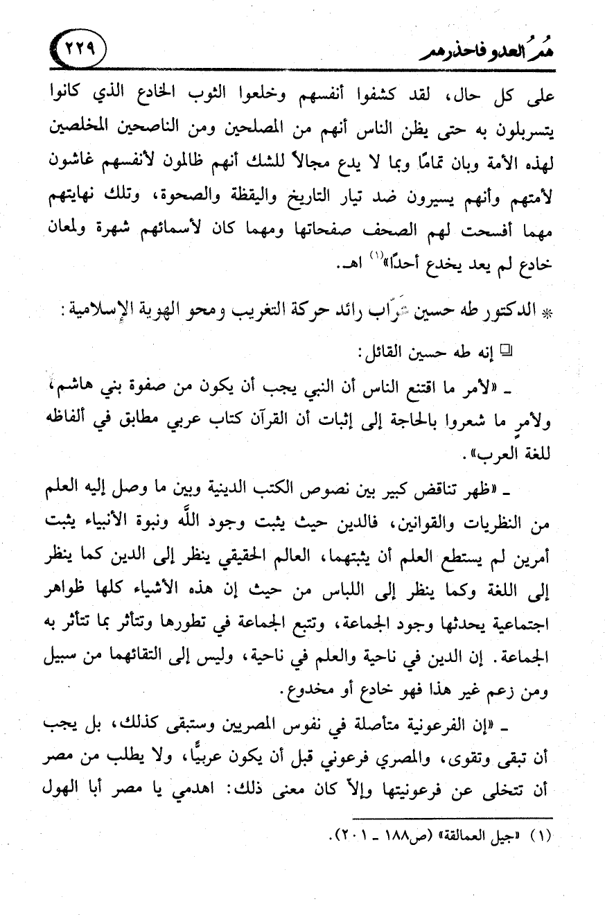 على كل حال، لقد كشفوا أنفسهم وخلعوا الثوب الخادع الذي كانوا يتسربلون به حتى يظن الناس أنهم من المصلحين ومن الناصحين المخلصين لهذه الأمة وبان تمامًا وبما لا يدع مجالاً للشك أنهم ظالمون لأنفسهم غاشون لأمتهم وأنهم يسيرون ضد تيار التاريخ واليقظة والصحوة، وتلك نهايتهم مهما أفسحت لهم الصحف صفحاتها ومهما كان لأسمائهم شهرة ولمعان خادع لم يعد يخدع أحدًا" (1) اهـ.