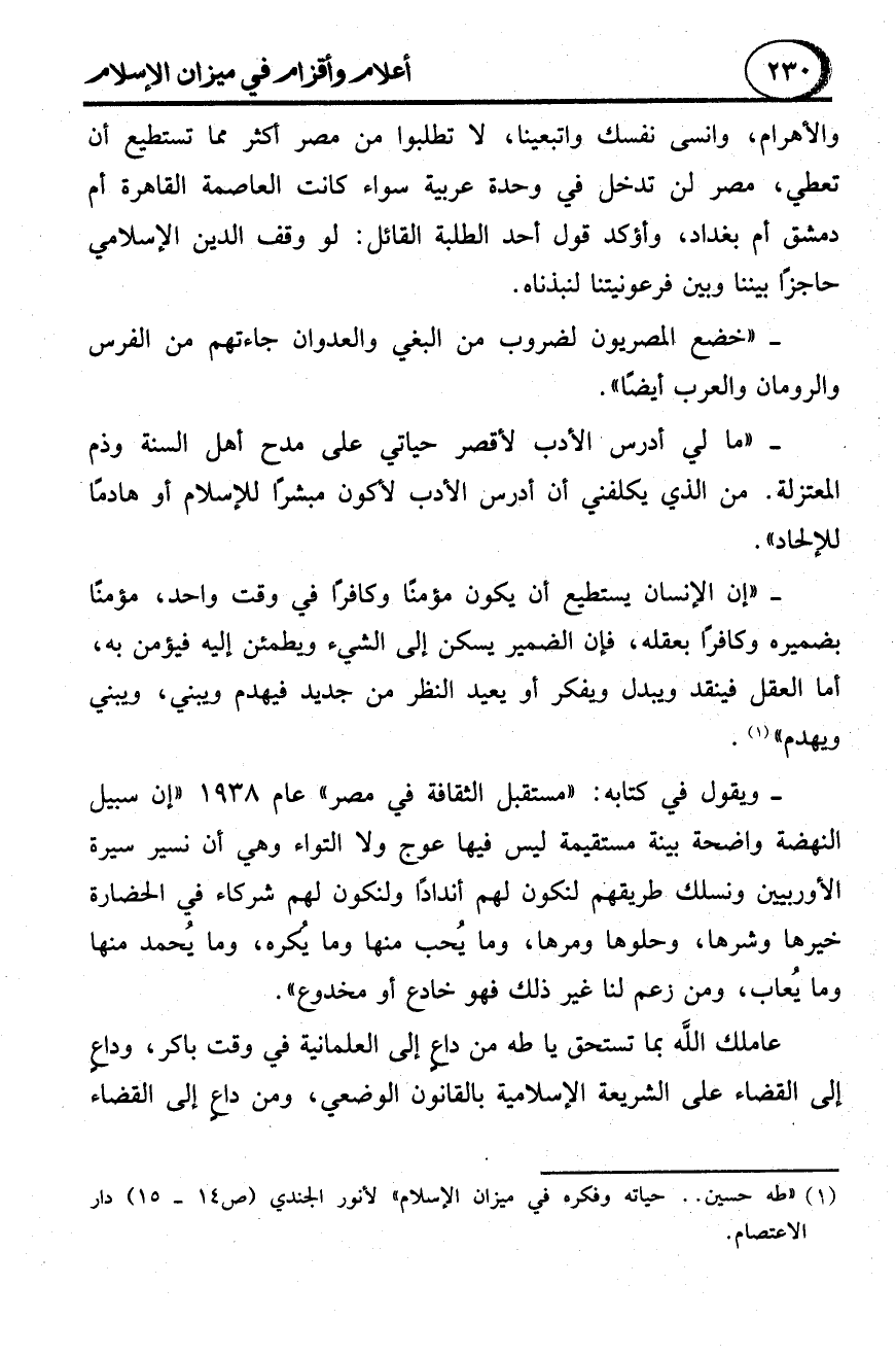 عاملك الله بما تستحق يا طه من داعٍ إلى العلمانية في وقت باكر، وداع إلى القضاء على الشريعة الإسلامية بالقانون الوضعي، ومن داع إلى القضاء