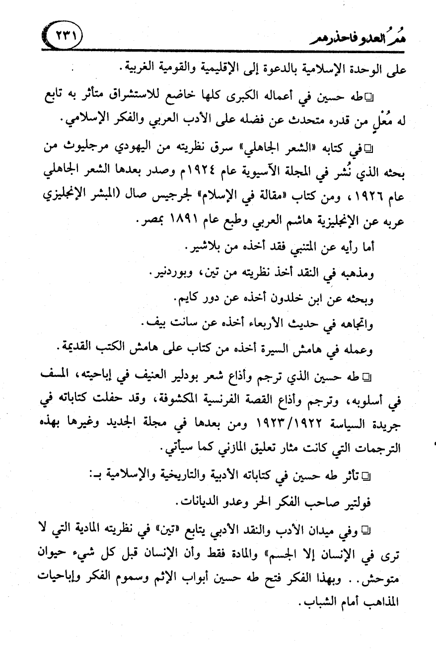 - طه حسين في أعماله الكبرى كلها خاضع للاستشراق متأثر به تابع له مُعْلٍ من قدره متحدث عن فضله على الأدب العربي والفكر الإسلامي.