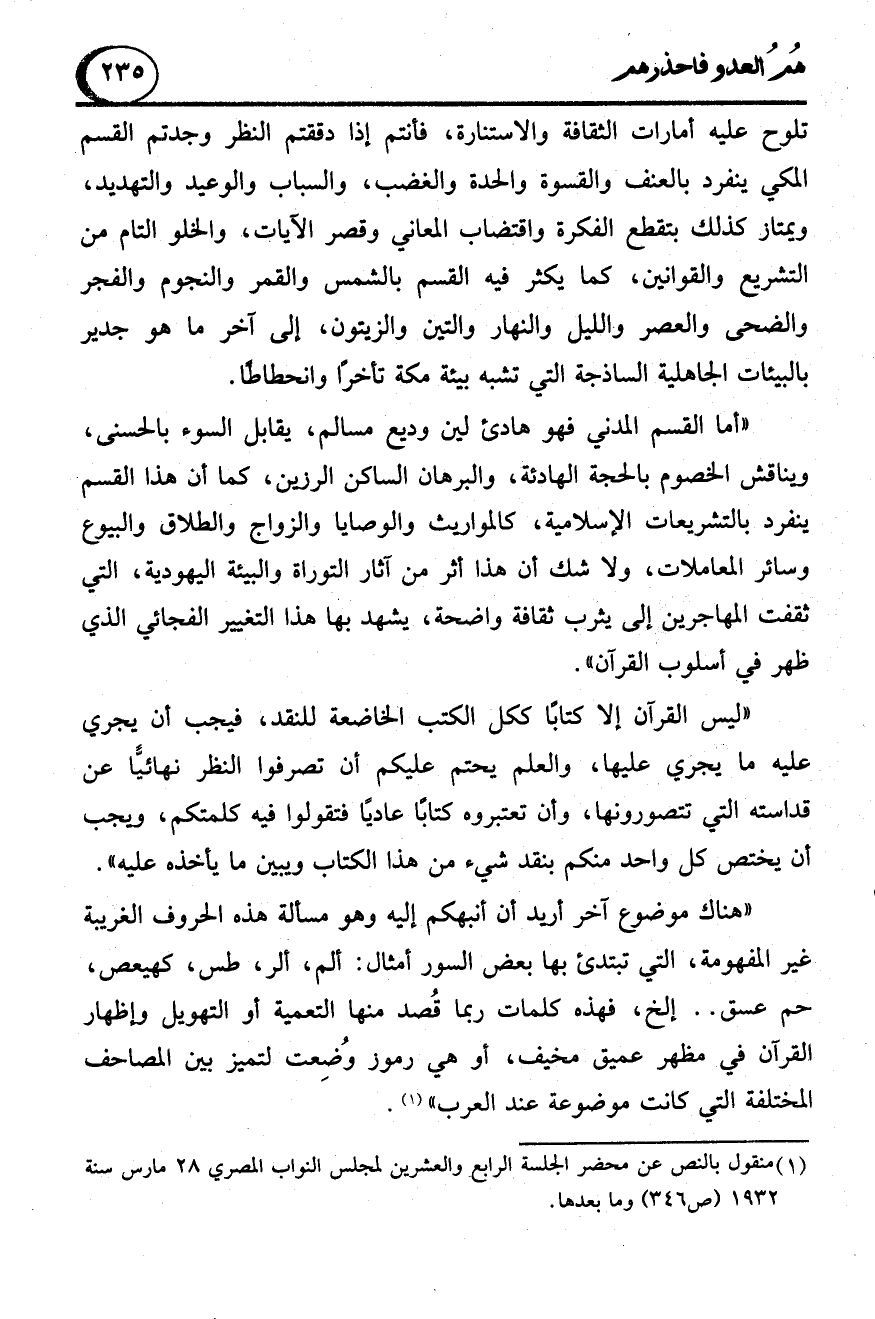 تلوح عليه أمارات الثقافة والاستنارة، فأنتم إذا دققتم النظر وجدتم القسم المكي ينفرد بالعنف والقسوة والحدة والغضب، والسباب والوعيد والتهديد، ويمتاز كذلك بتقطع الفكرة واقتضاب المعاني وقصر الآيات، والخلو التام من التشريع والقوانين، كما يكثر فيه القسم بالشمس والقمر والنجوم والفجر والضحى والعصر والليل والنهار والتين والزيتون، إلى آخر ما هو جدير بالبيئات الجاهلية الساذجة التي تشبه بيئة مكة تأخرًا وانحطاطًا.