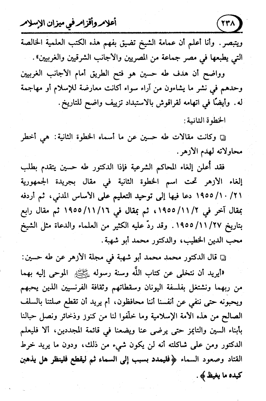 - وكانت مقالات طه حسين عن ما أسماه الخطوة الثانية: هي أخطر محاولاته لهدم الأزهر.