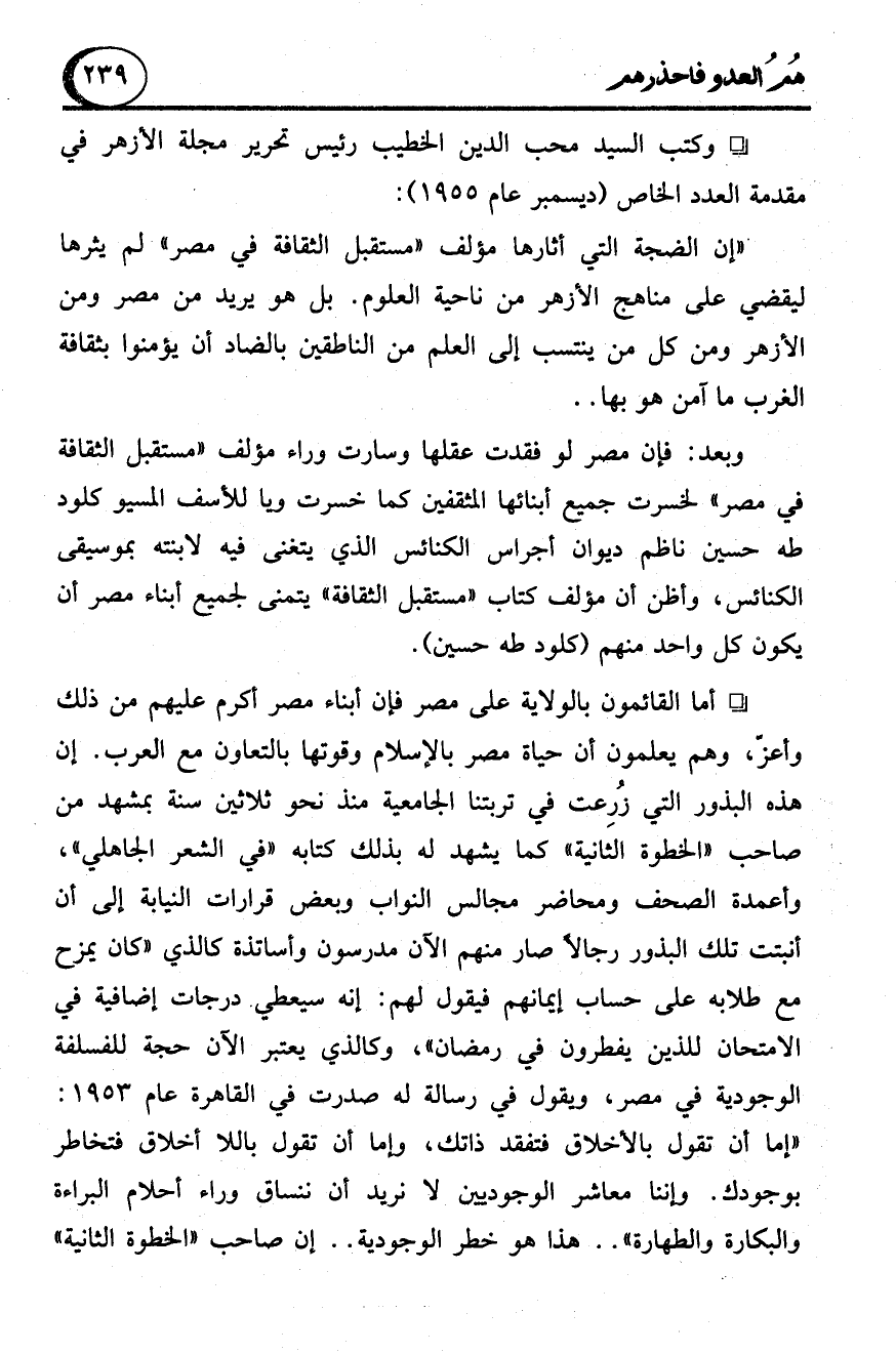 - أما القائمون بالولاية على مصر فإن أبناء مصر أكرم عليهم من ذلك وأعز، وهم يعلمون أن حياة مصر بالإسلام وقوتها بالتعاون مع العرب. إن هذه البذور التي زُرِعت في تربتنا الجامعية منذ نحو ثلاثين سنة بمشهد من صاحب "الخطوة الثانية" كما يشهد له بذلك كتابه "في الشعر الجاهلي"، وأعمدة الصحف ومحاضر مجالس النواب وبعض قرارات النيابة إلى أن أنبتت تلك البذور رجالاً صار منهم الآن مدرسون وأساتذة كالذي "كان يمزح مع طلابه على حساب إيمانهم فيقول لهم: إنه سيعطي درجات إضافية في الامتحان للذين يفطرون في رمضان"، وكالذي يعتبر الآن حجة للفسلفة الوجودية في مصر، ويقول في رسالة له صدرت في القاهرة عام 1953: