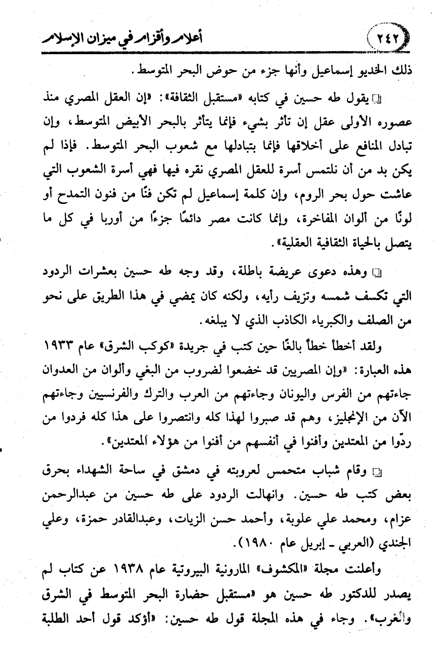 - يقول طه حسين في كتابه "مستقبل الثقافة": "إن العقل المصري منذ عصوره الأولى عقل إن تأثر بشيء فإنما يتأثر بالبحر الأبيض المتوسط، وإن تبادل المنافع على أخلاقها فإنما بتبادلها مع شعوب البحر المتوسط. فإذا لم يكن بد من أن نلتمس أسرة للعقل المصري نقره فيها فهي أسرة الشعوب التي عاشت حول بحر الروم، وإن كلمة إسماعيل لم تكن فنًا من فنون التمدح أو لونًا من ألوان المفاخرة، وإنما كانت مصر دائمًا جزءًا من أوربا في كل ما يتصل بالحياة الثقافية العقلية".