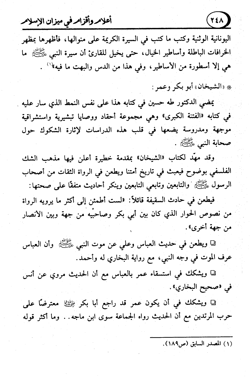 وقد مهّد لكتاب "الشيخان" بمقدمة خطيرة أعلن فيها مذهب الشك الفلسفي بوضوح فيعبث في تاريخ أمتنا ويطعن في الرواة الثقات من أصحاب الرسول - صلى الله عليه وسلم - والتابعين وتابعي التابعين وينكر أحاديث متفقًا على صحتها: