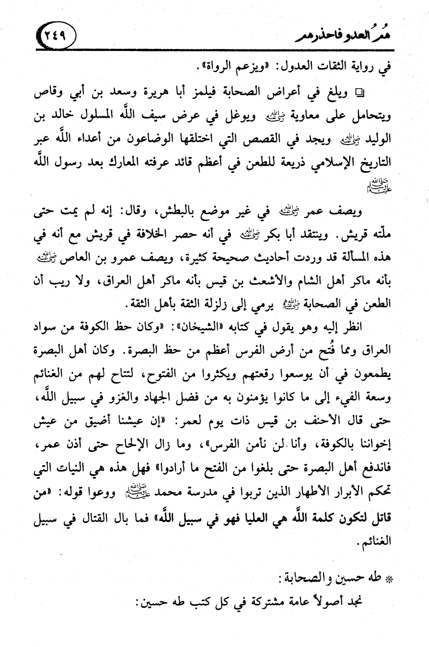 انظر إليه وهو يقول في كتابه "الشيخان": "وكان حظ الكوفة من سواد العراق ومما فُتح من أرض الفرس أعظم من حظ البصرة. وكان أهل البصرة يطمعون في أن يوسعوا رقعتهم ويكثروا من الفتوح، لتتاح لهم من الغنائم وسعة الفيء إلى ما كانوا يؤمنون به من فضل الجهاد والغزو في سبيل الله، حتى قال الأحنف بن قيس ذات يوم لعمر: "إن عيشنا أضيق من عيش إخواننا بالكوفة، وأنا لن نأمن الفرس"، وما زال الإلحاح حتى أذن عمر، فاندفع أهل البصرة حتى بلغوا من الفتح ما أرادو" فهل هذه هي النيات التي تحكم الأبرار الأطهار الذين تربوا في مدرسة محمد - صلى الله عليه وسلم - ووعوا قوله: "من قاتل لتكون كلمة الله هي العليا فهو في سبيل الله" فما بال القتال في سبيل الغنائم.