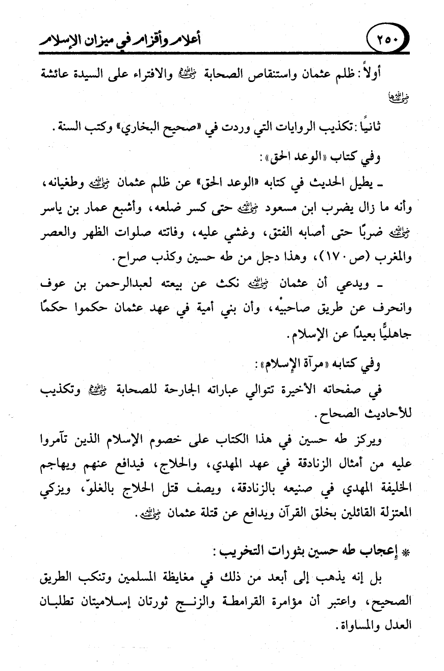 - يطيل الحديث في كتابه "الوعد الحق" عن ظلم عثمان -رضي الله عنه- وطغيانه، وأنه ما زال يضرب ابن مسعود -رضي الله عنه- حتى كسر ضلعه، وأشبع عمار بن ياسر -رضي الله عنه- ضربًا حتى أصابه الفتق، وغشي عليه، وفاتته صلوات الظهر والعصر والمغرب (ص 170)، وهذا دجل من طه حسين وكذب صراح.