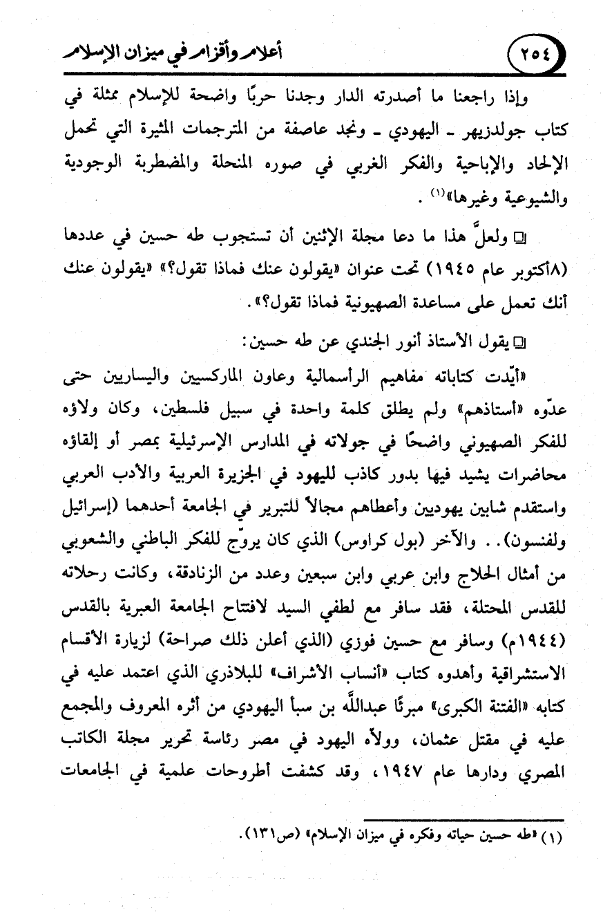 (1) "طه حسين حياته وفكره في ميزان الإسلام" (ص 131).