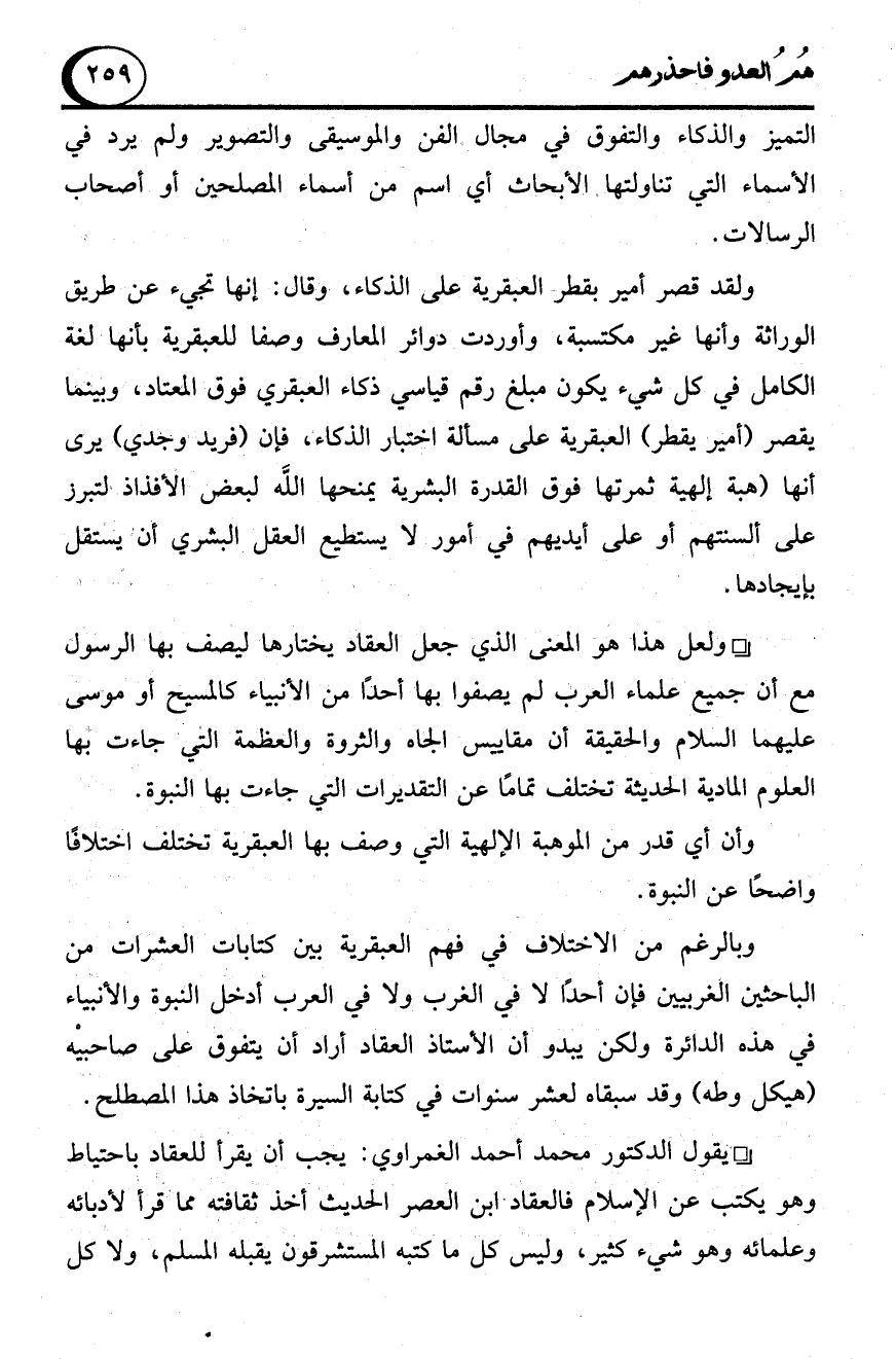 - يقول الدكتور محمد أحمد الغمراوي: يجب أن يقرأ للعقاد باحتياط وهو يكتب عن الإسلام فالعقاد ابن العصر الحديث أخذ ثقافته مما قرأ لأدبائه وعلمائه وهو شيء كثير، وليس كل ما كتبه المستشرقون يقبله المسلم، ولا كل