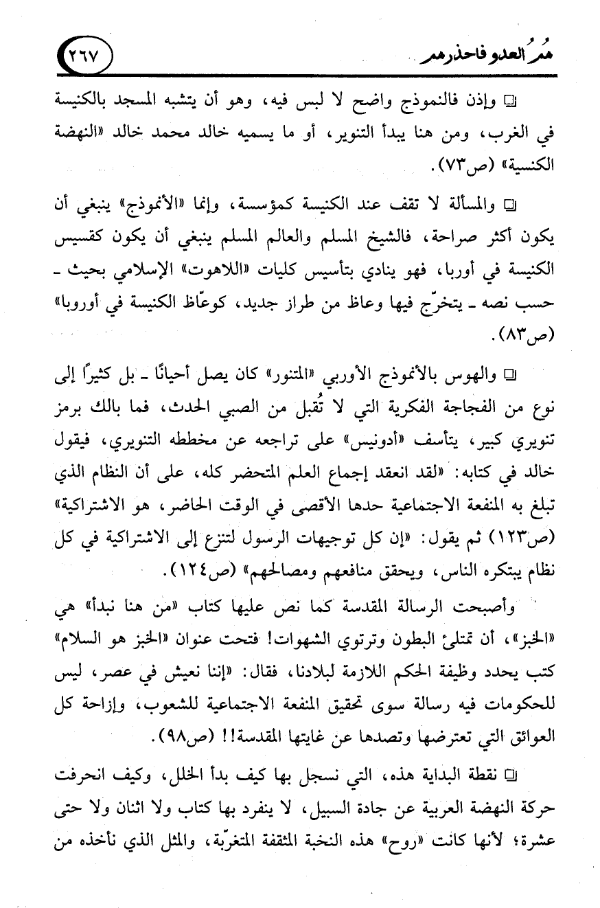 - وإذن فالنموذج واضح لا لبس فيه، وهو أن يتشبه المسجد بالكنيسة في الغرب، ومن هنا يبدأ التنوير، أو ما يسميه خالد محمد خالد "النهضة الكنسية" (ص73).