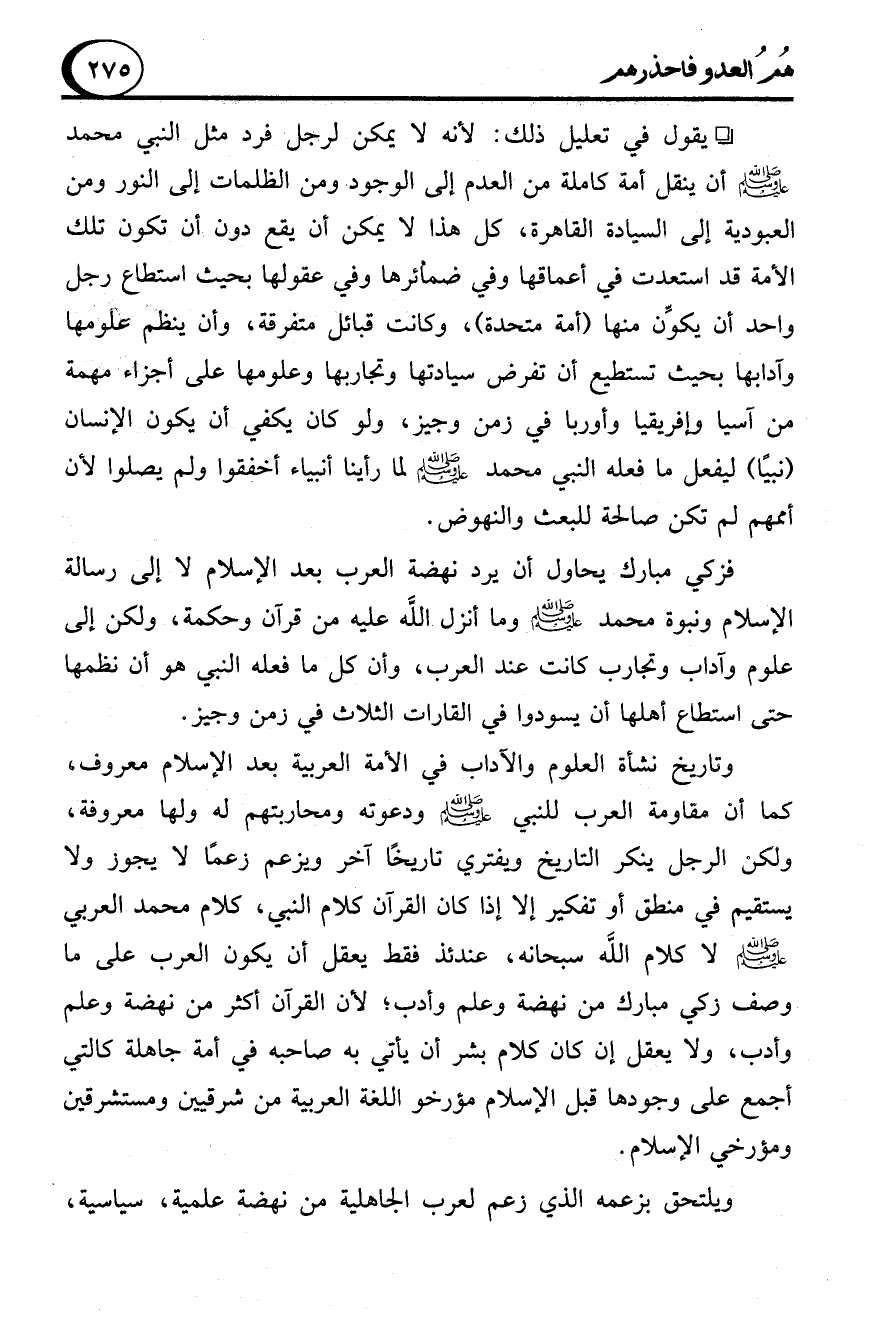 وتاريخ نشأة العلوم والآداب في الأمة العربية بعد الإسلام معروف، كما أن مقاومة العرب للنبي - صلى الله عليه وسلم - ودعوته ومحاربتهم له ولها معروفة، ولكن الرجل ينكر التاريخ ويفتري تاريخًا آخر ويزعم زعمًا لا يجوز ولا يستقيم في منطق أو تفكير إلا إذا كان القرآن كلام النبي، كلام محمد العربي - صلى الله عليه وسلم - لا كلام الله سبحانه، عندئذ فقط يعقل أن يكون العرب على ما وصف زكي مبارك من نهضة وعلم وأدب؛ لأن القرآن أكثر من نهضة وعلم وأدب، ولا يعقل إن كان كلام بشر أن يأتي به صاحبه في أمة جاهلة كالتي أجمع على وجودها قبل الإسلام مؤرخو اللغة العربية من شرقيين ومستشرقين ومؤرخي الإسلام.