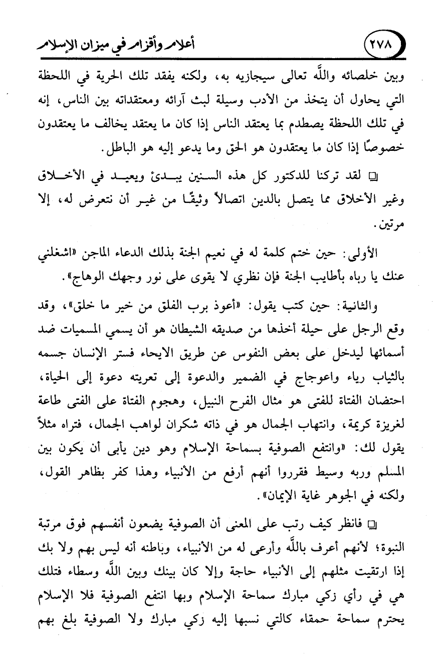 - فانظر كيف رتب على المعنى أن الصوفية يضعون أنفسهم فوق مرتبة النبوة؛ لأنهم أعرف بالله وأرعى له من الأنبياء، وباطنه أنه ليس بهم ولا بك إذا ارتقيت مثلهم إلى الأنبياء حاجة وإلا كان بينك وبين الله وسطاء فتلك هي في رأي زكي مبارك سماحة الإسلام وبها انتفع الصوفية فلا الإسلام يحترم سماحة حمقاء كالتي نسبها إليه زكي مبارك ولا الصوفية بلغ بهم