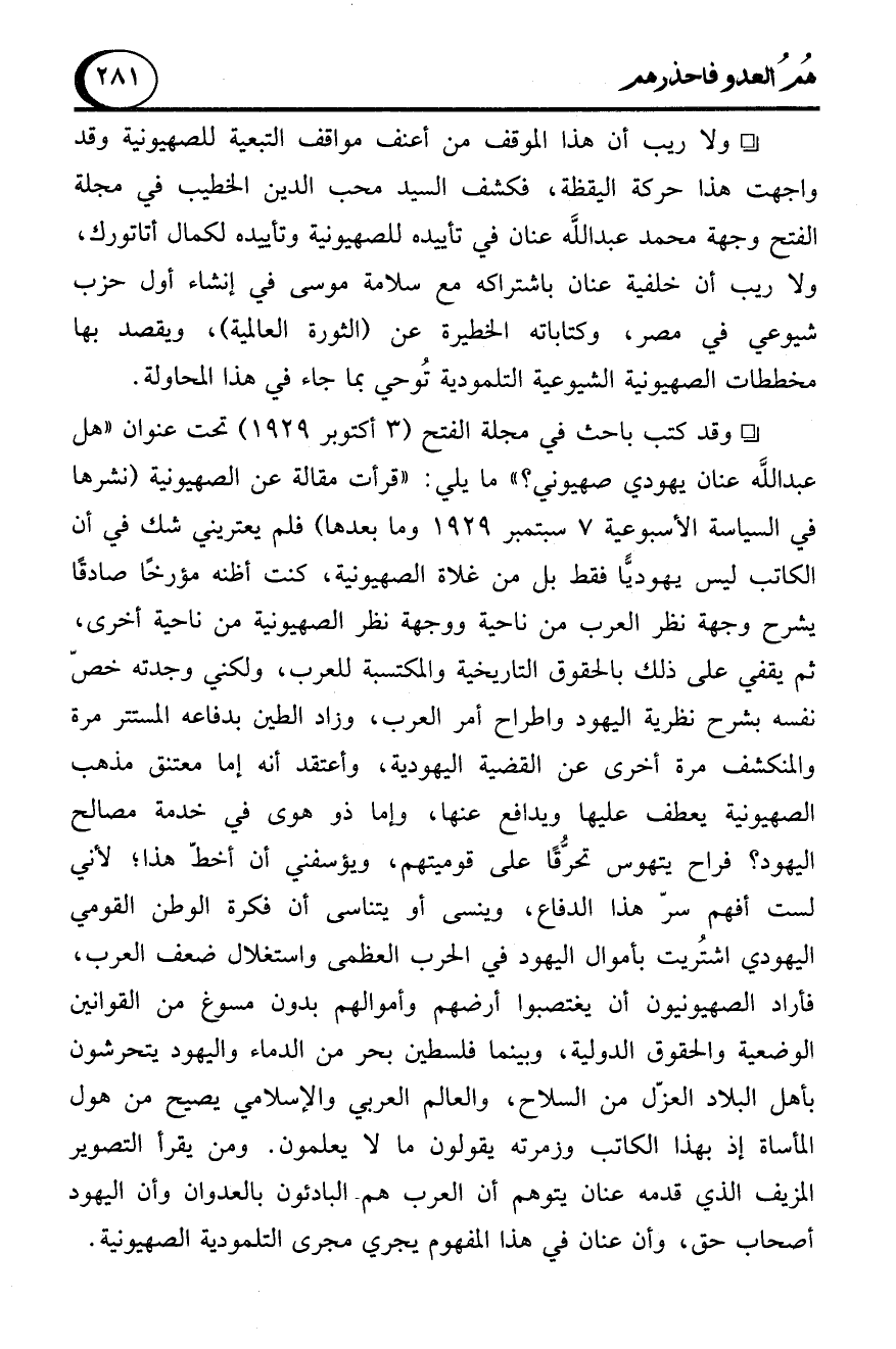 - ولا ريب أن هذا الموقف من أعنف مواقف التبعية للصهيونية وقد واجهت هذا حركة اليقظة، فكشف السيد محب الدين الخطيب في مجلة الفتح وجهة محمد عبد الله عنان في تأييده للصهيونية وتأييده لكمال أتاتورك، ولا ريب أن خلفية عنان باشتراكه مع سلامة موسى في إنشاء أول حزب شيوعي في مصر، وكتاباته الخطيرة عن (الثورة العالمية)، ويقصد بها مخططات الصهيونية الشيوعية التلمودية تُوحي بما جاء في هذا المحاولة.