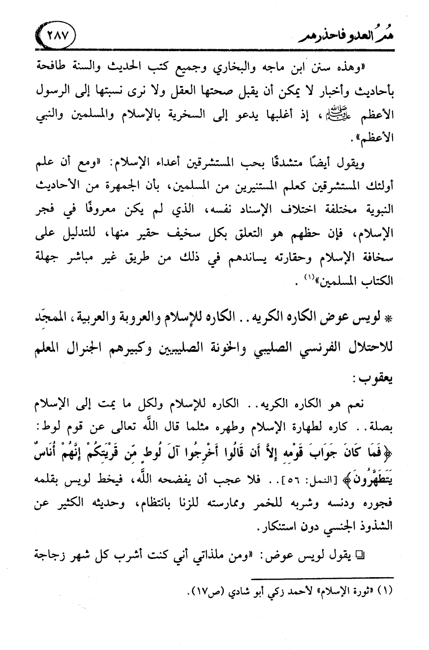 نعم هو الكاره الكريه .. الكاره للإسلام ولكل ما يمت إلى الإسلام بصلة .. كاره لطهارة الإسلام وطهره مثلما قال الله تعالى عن قوم لوط: {فَمَا كَانَ جَوَابَ قَوْمِهِ إِلَّا أَنْ قَالُوا أَخْرِجُوا آلَ لُوطٍ مِنْ قَرْيَتِكُمْ إِنَّهُمْ أُنَاسٌ يَتَطَهَّرُونَ} [النمل: 56] .. فلا عجب أن يفضحه الله، فيخط لويس بقلمه فجوره ودنسه وشربه للخمر وممارسته للزنا بانتظام، وحديثه الكثير عن الشذوذ الجنسي دون استنكار.