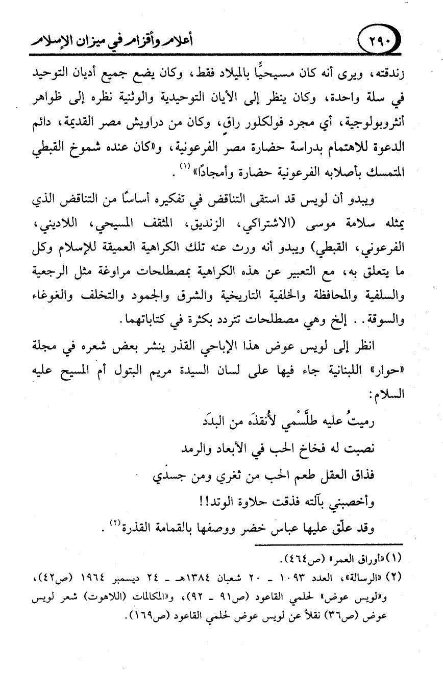 (2) " الرسالة"، العدد 1093 - 20 شعبان 1384 هـ - 24 في ديسمبر 1964 (ص 42)، و"لويس عوض" لحلمي القاعود (ص 91 - 92)، و"المكالمات (اللاهوت) شعر لويس عوض (ص 36) نقلاً عن لويس عوض لحلمي القاعود (ص 169).