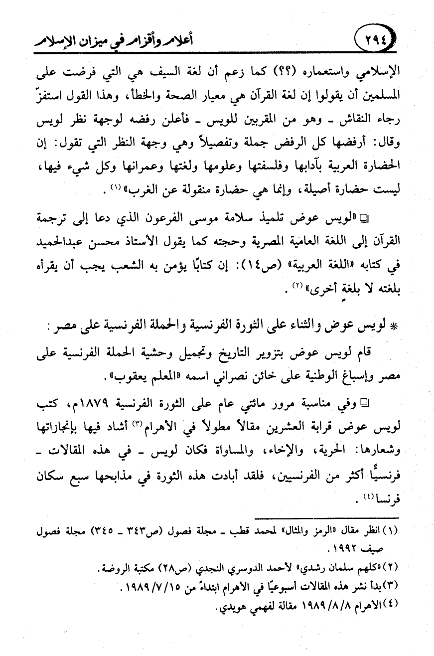 - "لويس عوض تلميذ سلامة موسى الفرعون الذي دعا إلى ترجمة القرآن إلى اللغة العامية المصرية وحجته كما يقول الأستاذ محسن عبد الحميد في كتابه "اللغة العربية" (ص 14): إن كتابا يؤمن به الشعب يجب أن يقرأه بلغته لا بلغةٍ أخرى" (2).