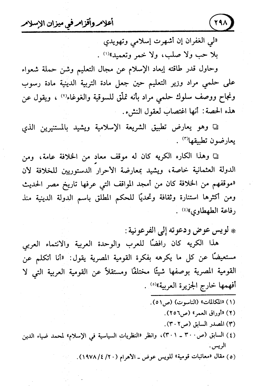 - وهو يعارض تطبيق الشريعة الإسلامية ويشيد بالمستنيرين الذي يعارضون تطبيقها (3).