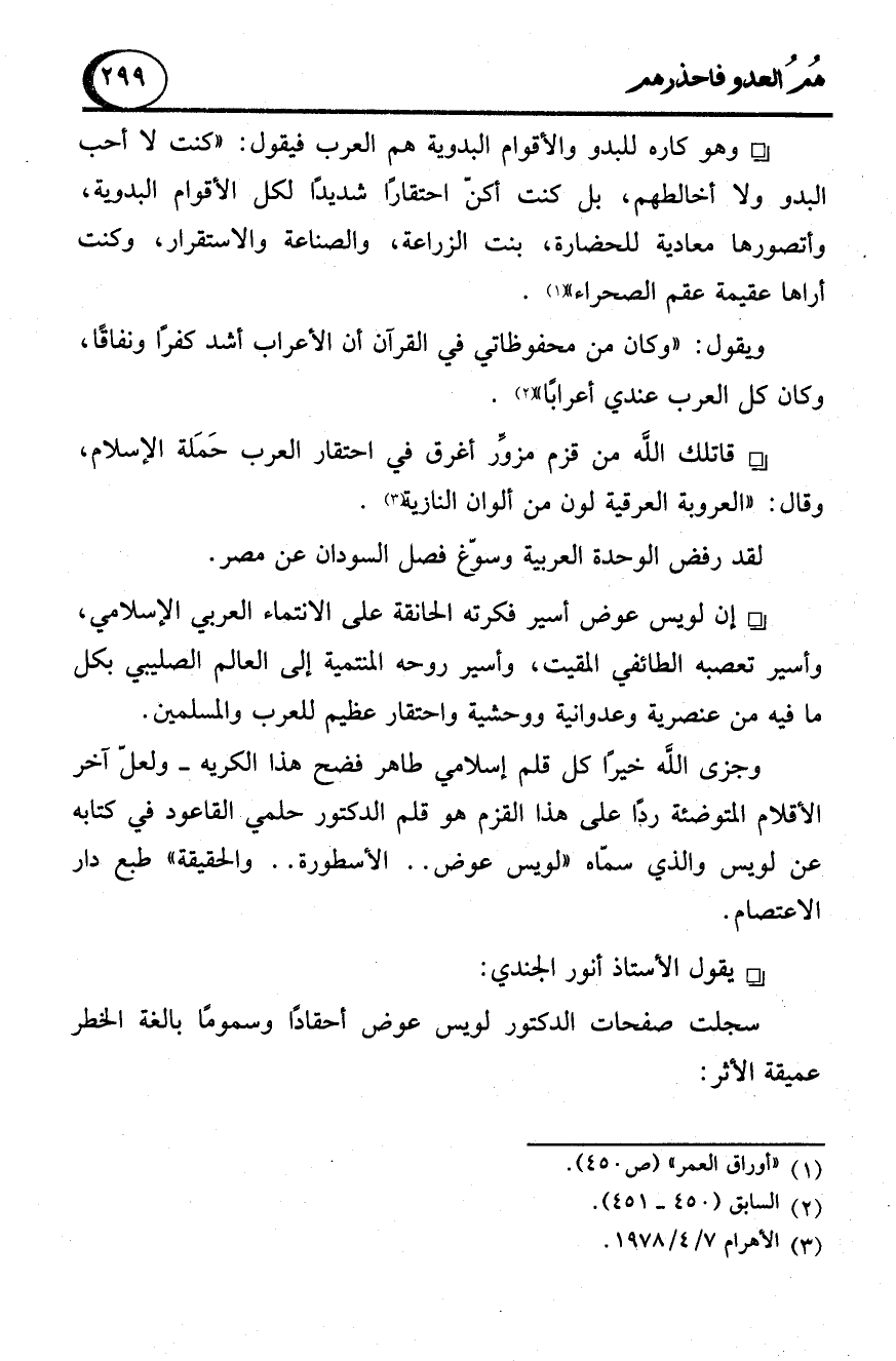 - إن لويس عوض أسير فكرته الحانقة على الانتماء العربي الإسلامي، وأسير تعصبه الطائفي المقيت، وأسير روحه المنتمية إلى العالم الصليبي بكل ما فيه من عنصرية وعدوانية ووحشية واحتقار عظيم للعرب والمسلمين.