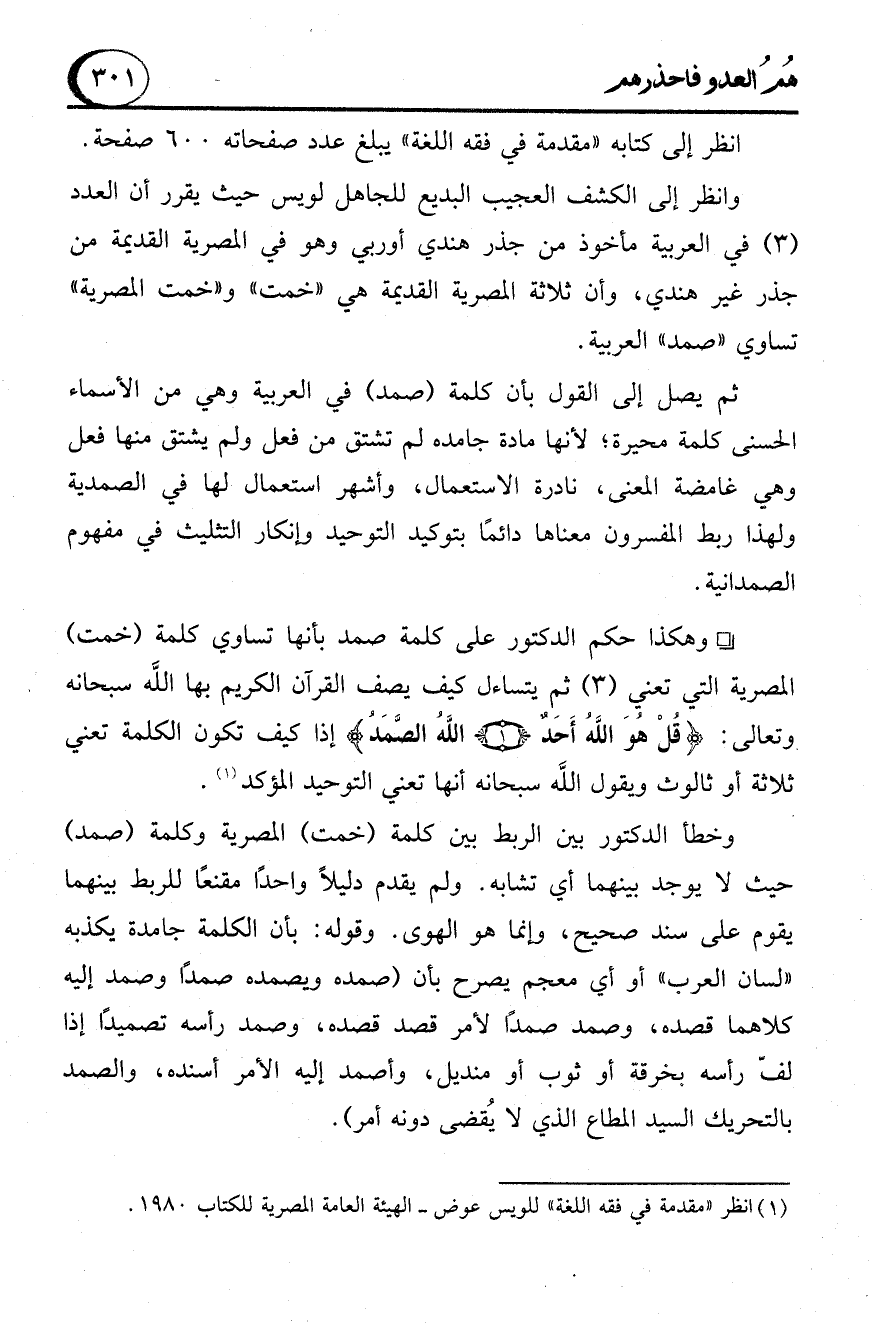 - وهكذا حكم الدكتور على كلمة صمد بأنها تساوي كلمة (خمت) المصرية التي تعني (3) ثم يتساءل كيف يصف القرآن الكريم بها الله سبحانه وتعالى: {قُلْ هُوَ اللهُ أَحَدٌ (1) اللهُ الصَّمَدُ} إذا كيف تكون الكلمة تعني ثلاثة أو ثالوث ويقول الله سبحانه أنها تعني التوحيد المؤكد (1).