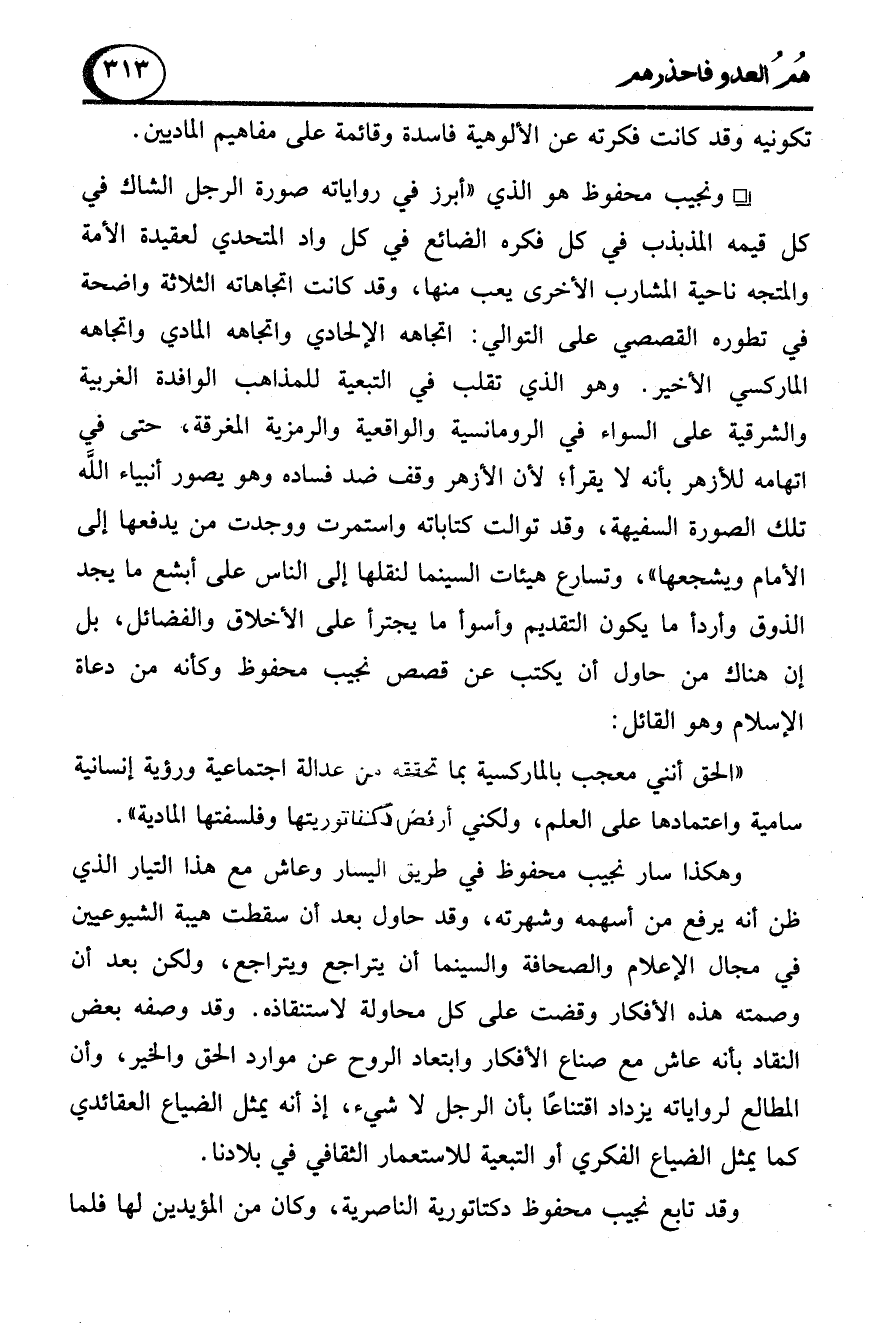 - ونجيب محفوظ هو الذي "أبرز في رواياته صورة الرجل الشاك في كل قيمه المذبذب في كل فكره الضائع في كل واد المتحدي لعقيدة الأمة والمتجه ناحية المشارب الأخرى يعب منها، وقد كانت اتجاهاته الثلاثة واضحة في تطوره القصصي على التوالي: اتجاهه الإلحادي واتجاهه المادي واتجاهه الماركسي الأخير. وهو الذي تقلب في التبعية للمذاهب الوافدة الغربية والشرقية على السواء في الرومانسية والواقعية والرمزية المغرقة، حتى في اتهامه للأزهر بأنه لا يقرأ؛ لأن الأزهر وقف ضد فساده وهو يصور أنبياء الله تلك الصورة السفيهة، وقد توالت كتاباته واستمرت ووجدت من يدفعها إلى الأمام ويشجعها"، وتسارع هيئات السينما لنقلها إلى الناس على أبشع ما يجد الذوق وأردأ ما يكون التقديم وأسوأ ما يجترأ على الأخلاق والفضائل، بل إن هناك من حاول أن يكتب عن قصص نجيب محفوظ وكأنه من دعاة الإسلام وهو القائل: