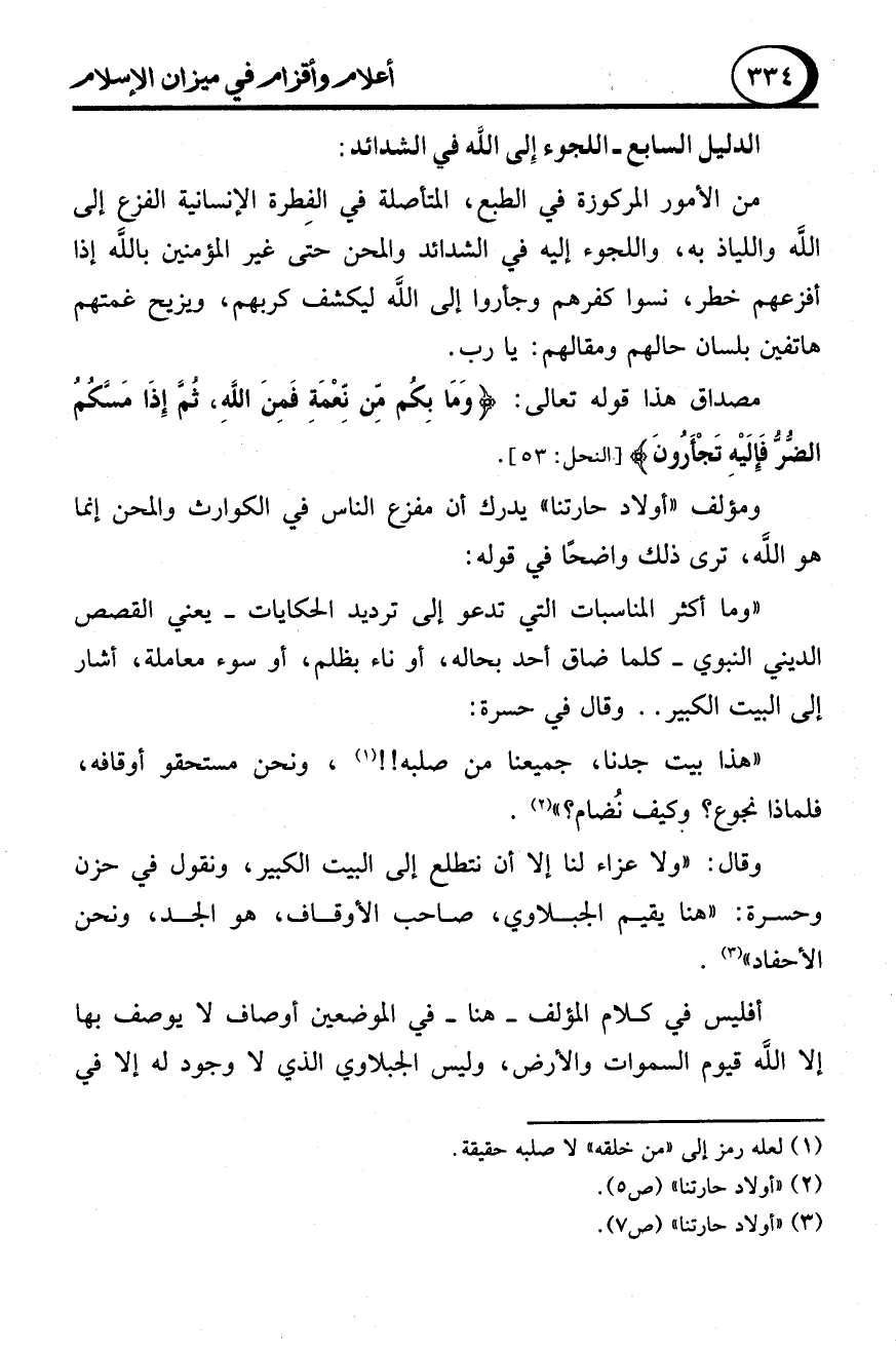 ومؤلف "أولاد حارتنا" يدرك أن مفزع الناس في الكوارث والمحن إنما هو الله، ترى ذلك واضحًا في قوله: