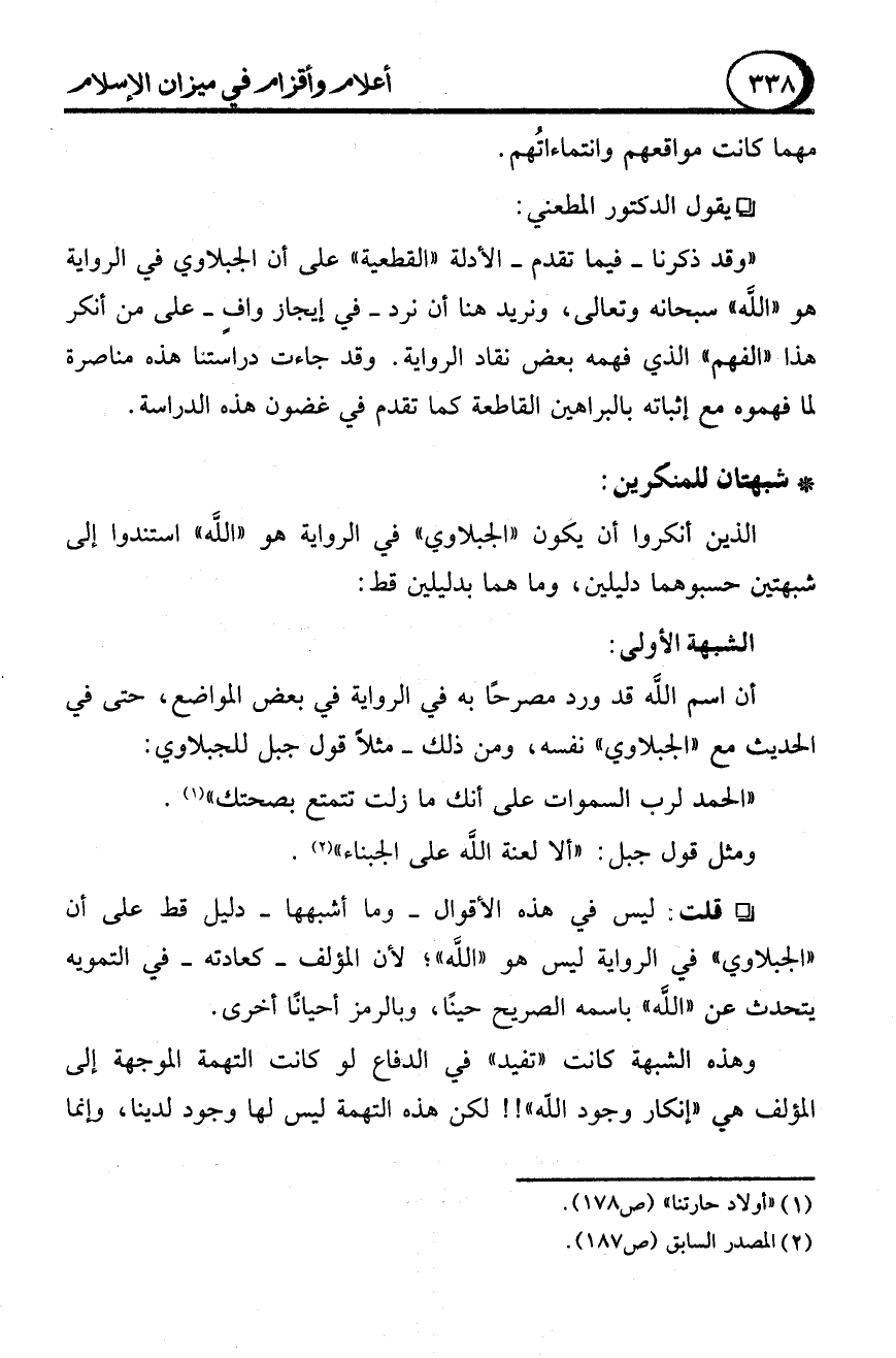 الذين أنكروا أن يكون "الجبلاوي" في الرواية هو "الله " استندوا إلى شبهتين حسبوهما دليلين، وما هما بدليلين قط:
