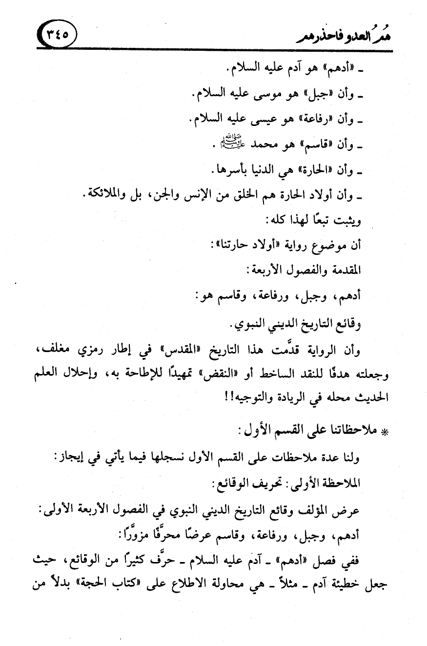 عرض المؤلف وقائع التاريخ الديني النبوي في الفصول الأربعة الأولى: أدهم، وجبل، ورفاعة، وقاسم عرضا محرَّفًا مزوَّرًا: