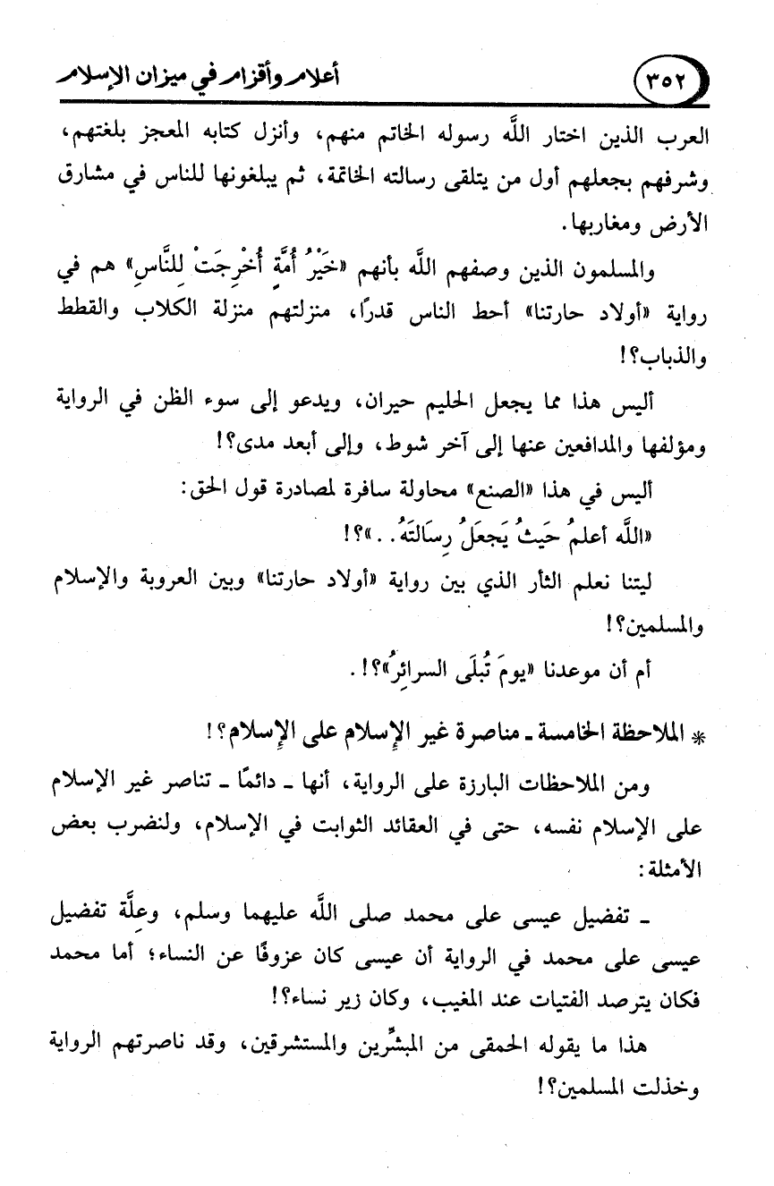 - تفضيل عيسى على محمد صلى الله عليهما وسلم، وعِلَّة تفضيل عيسى على محمد في الرواية أن عيسى كان عزوفًا عن النساء؛ أما محمد فكان يترصد الفتيات عند المغيب، وكان زير نساء؟!