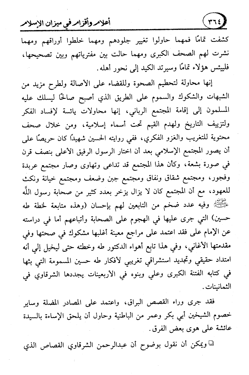 فقد جرى وراء القصص البراق، واعتمد على المصادر المضلة وساير خصوم الشيخين أبي بكر وعمر من الباطنية وحاول أن يلحق الإساءة بالسيدة عائشة على هوى بعض الفرق.