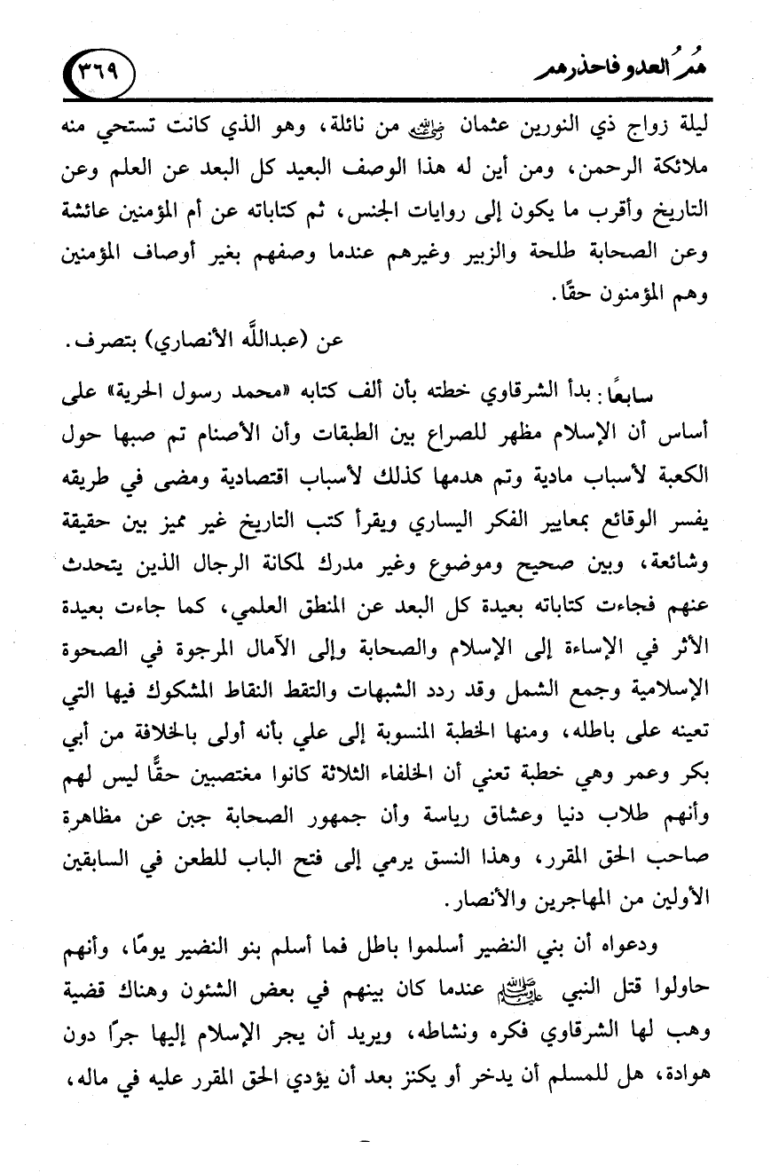 ليلة زواج ذي النورين عثمان - رضي الله عنه - من نائلة، وهو الذي كانت تستحي منه ملائكة الرحمن، ومن أين له هذا الوصف البعيد كل البعد عن العلم وعن التاريخ وأقرب ما يكون إلى روايات الجنس، ثم كتاباته عن أم المؤمنين عائشة وعن الصحابة طلحة والزبير وغيرهم عندما وصفهم بغير أوصاف المؤمنين وهم المؤمنون حقًا.