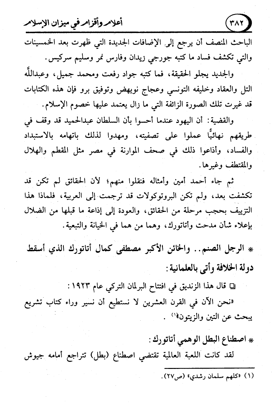 ثم جاء أحمد أمين وأمثاله فنقلوا منهم؛ لأن الحقائق لم تكن قد تكشفت بعد، ولم تكن البروتوكولات قد ترجمت. إلى العربية، فلماذا هذا التزييف بحجب مرحلة من الحقائق، والعودة إلى إذاعة ما قبلها من الضلال بإعلاء شأن مدحت وأتاتورك، وهما من هما في الخيانة والتبعية.
