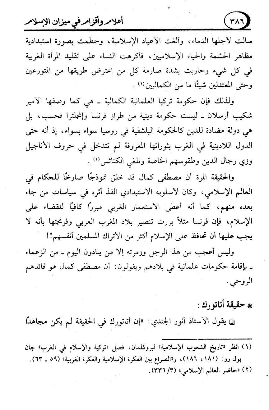 وليس أعجب من هذا الرجل وزمرته إلا من ينادون اليوم -من الزعماء- بإقامة حكومات علمانية في بلادهم ويقولون: أن مصطفى كمال هو قائدهم الروحي.