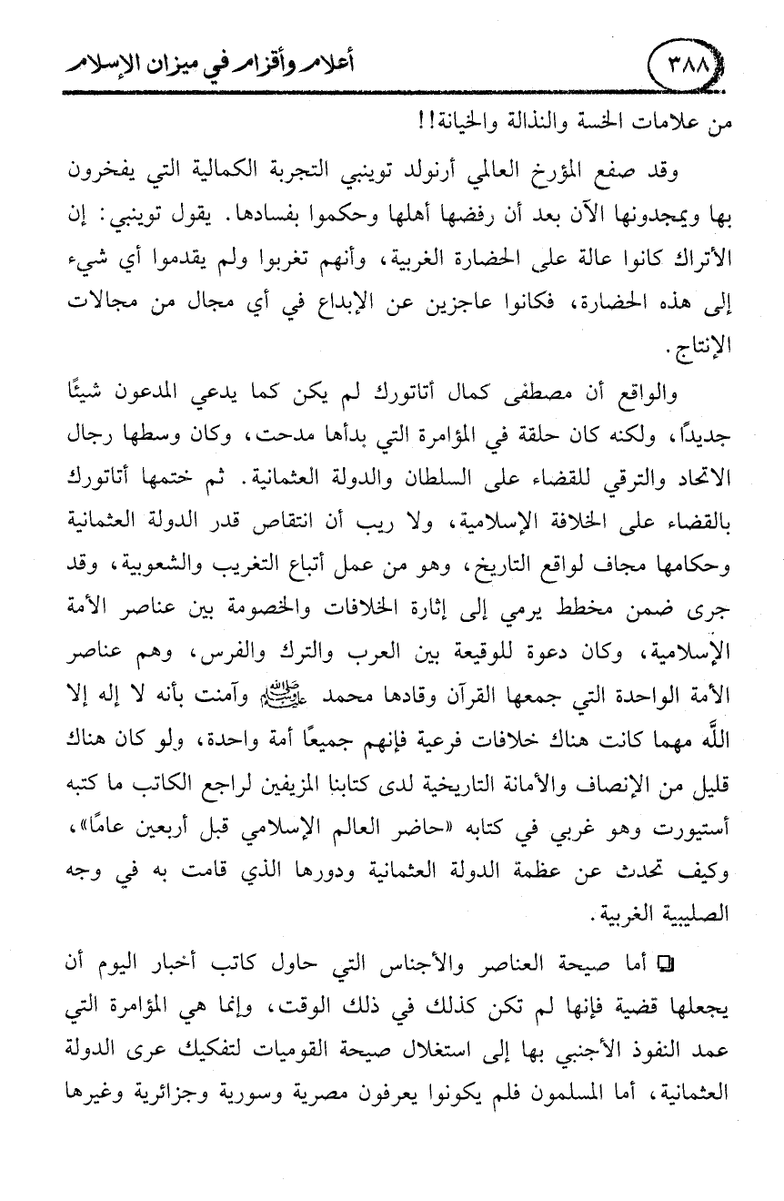 - أما صيحة العناصر والأجناس التي حاول كاتب أخبار اليوم أن يجعلها قضية فإنها لم تكن كذلك في ذلك الوقت، وإنما هي المؤامرة التي عمد النفوذ الأجنبي بها إلى استغلال صيحة القوميات لتفكيك عرى الدولة العثمانية، أما المسلمون فلم يكونوا يعرفون مصرية وسورية وجزائرية وغيرها