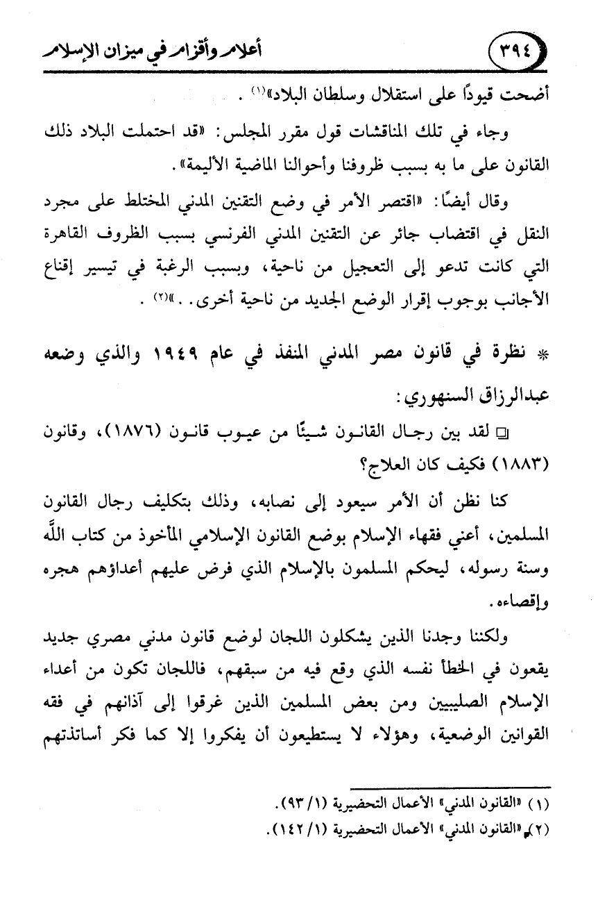 ولكننا وجدنا الذين يشكلون اللجان لوضع قانون مدني مصري جديد يقعون في الخطأ نفسه الذي وقع فيه من سبقهم، فاللجان تكون من أعداء الإسلام الصليبيين ومن بعض المسلمين الذين غرقوا إلى آذانهم في فقه القوانين الوضعية، وهؤلاء لا يستطيعون أن يفكروا إلا كما فكر أساتذتهم