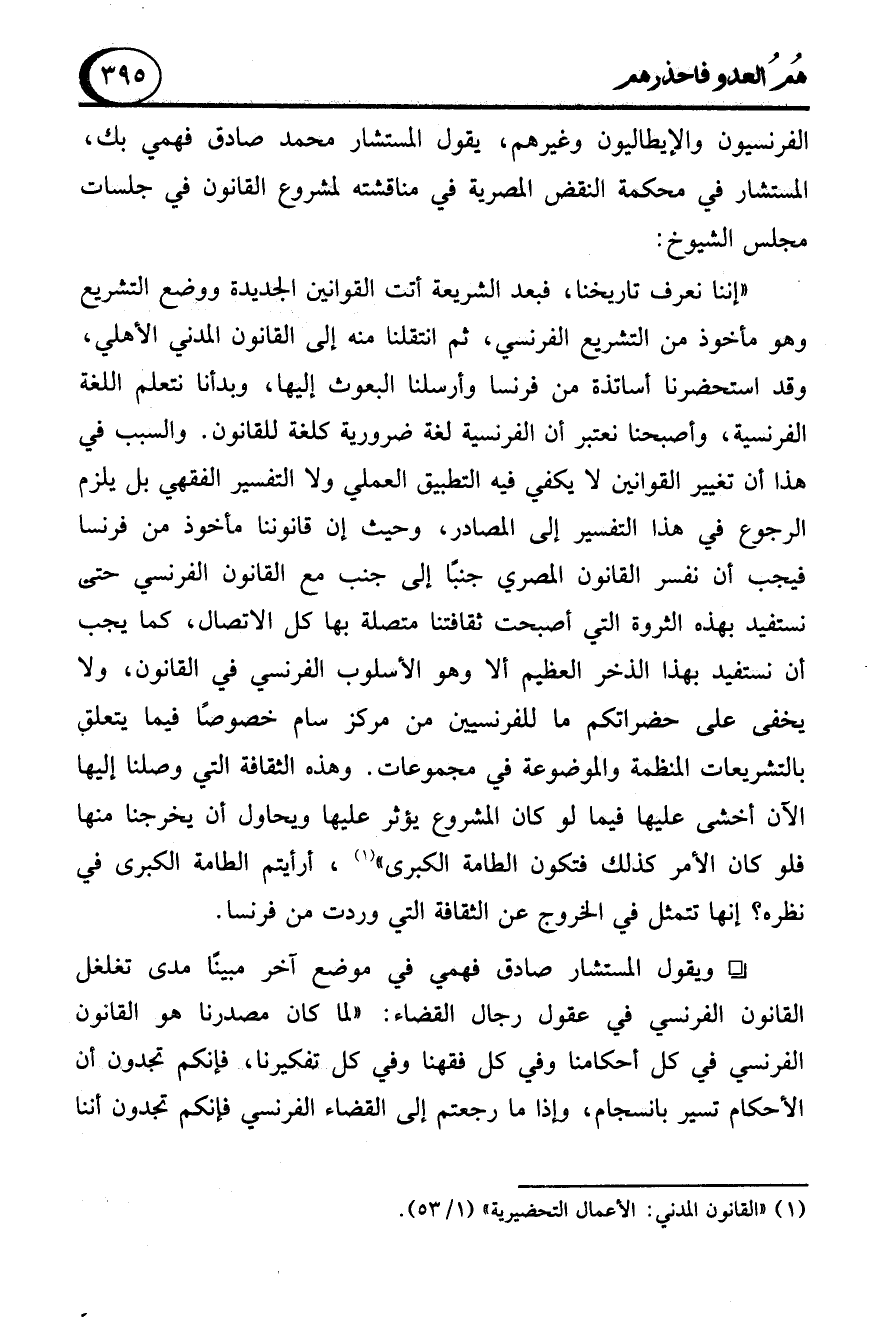 "إننا نعرف تاريخنا، فبعد الشريعة أتت القوانين الجديدة ووضع التشريع وهو مأخوذ من التشريع الفرنسي، ثم انتقلنا منه إلى القانون المدني الأهلي، وقد استحضرنا أساتذة من فرنسا وأرسلنا البعوث إليها، وبدأنا نتعلم اللغة الفرنسية، وأصبحنا نعتبر أن الفرنسية لغة ضرورية كلغة للقانون. والسبب في هذا أن تغيير القوانين لا يكفي فيه التطبيق العملي ولا التفسير الفقهي بل يلزم الرجوع في هذا التفسير إلى المصادر، وحيث إن قانوننا مأخوذ من فرنسا فيجب أن نفسر القانون المصري جنبًا إلى جنب مع القانون الفرنسي حتى نستفيد بهذه الثروة التي أصبحت ثقافتنا متصلة بها كل الاتصال، كما يجب أن نستفيد بهذا الذخر العظيم ألا وهو الأسلوب الفرنسي في القانون، ولا يخفى على حضراتكم ما للفرنسيين من مركز سام خصوصًا فيما يتعلق بالتشريعات المنظمة والموضوعة في مجموعات. وهذه الثقافة التي وصلنا إليها الآن أخشى عليها فيما لو كان المشروع يؤثر عليها ويحاول أن يخرجنا منها فلو كان الأمر كذلك فتكون الطامة الكبرى" (1)، أرأيتم الطامة الكبرى في نظره؟ إنها تتمثل في الخروج عن الثقافة التي وردت من فرنسا.