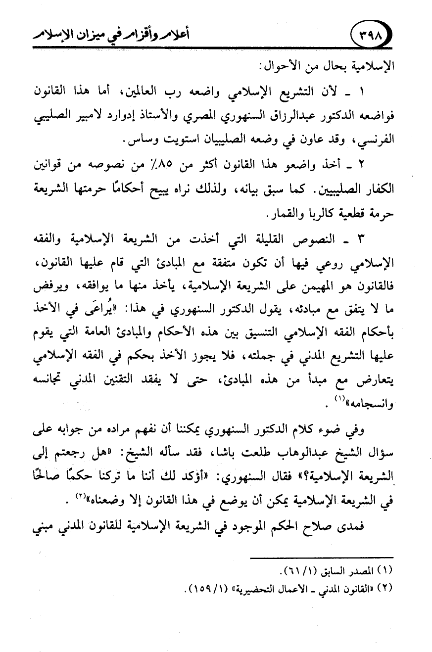 1 - لأن التشريع الإسلامي واضعه رب العالمين، أما هذا القانون فواضعه الدكتور عبد الرزاق السنهوري المصري والأستاذ إدوارد لامبير الصليبي الفرنسي، وقد عاون في وضعه الصليبيان استويت وساس.